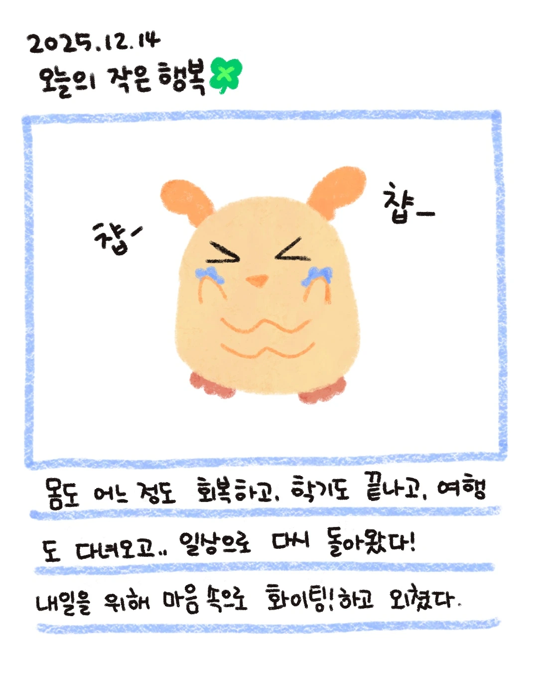 1박 2일간의 여행도 끝나고, 다시 일상이 시작됐다. 하나 차이점은 학교를 안 간다는 것. 하지만, 이번에는 할 일이 아주 많다. 차근차근해야지. 무리하지 말고!라고 다짐해 본다. 이런 일상 속에서 다시 행복을 찾아봐야지! 어쩌면, 이 일상 자체가 오늘의 작은 행복일지도 모르겠다.