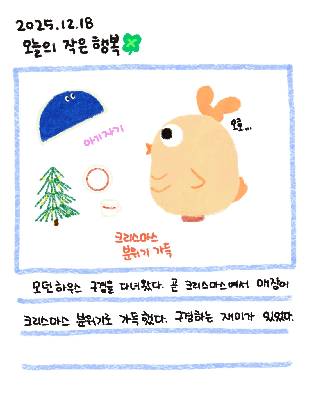 올해 크리스마스 시즌에는 새로운 경험을 많이 해보는 것 같다. 생애 처음, 모던하우스를 가봤다. 크리스마스 분위기로 가득했고 아기자기한 제품들이 많았다. 무언가를 구매하지 않아도 구경하는 재미가 있었고, 귀여운 발매트도 샀다. 꾸미는 걸 잘 못해서 모던하우스와는 거리가 멀었는데 이렇게 구경하는 것도 하나의 재미이자, 기분을 행복하게 해 줄 수 있는 것이라는 걸 알게 되었다.