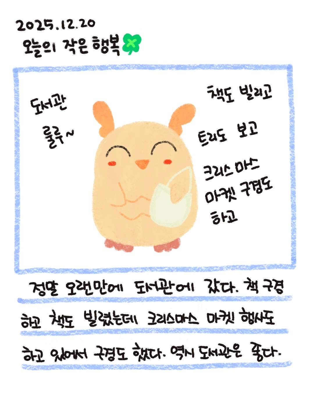 학기 끝나고 마음 편히 방문한 도서관! 책 구경과 책 빌리는 것만 생각하고 갔는데 크리스마스 마켓 행사를 하고 있었다! 사람들이 엄청 많았고, 청소년들의 공연도 진행되고 있었다. 아기자기한 소품들과 먹거리, 그 분위기를 즐기는 사람들. 청소년들의 멋진 춤까지. 나도 슬쩍 보고 자료실을 갔다가 집으로 가는 길에 또 한 번 슬쩍 봤다. 흐뭇하게 바라보는 내 모습에서 살짝.. 어른의 느낌(?)과 함께