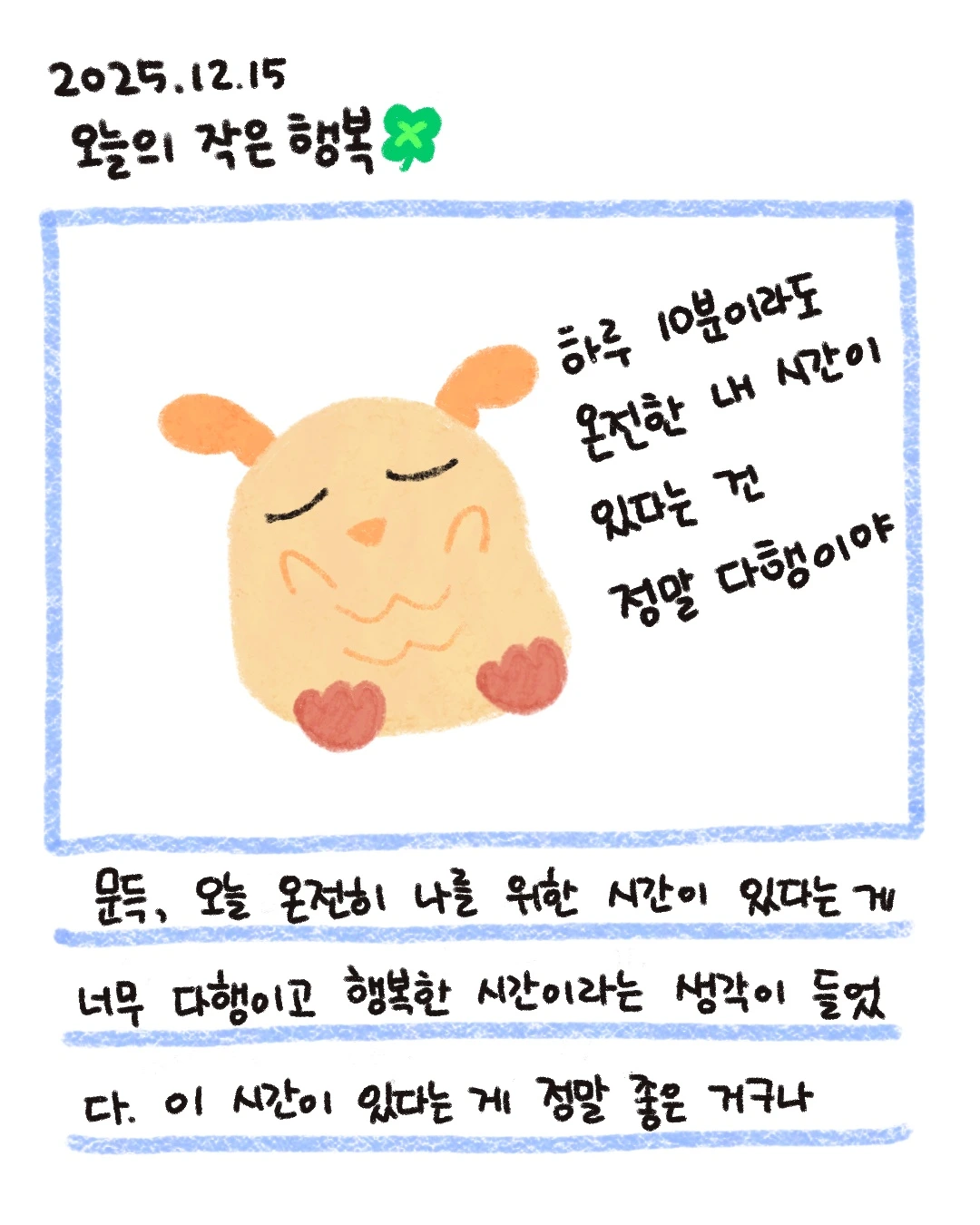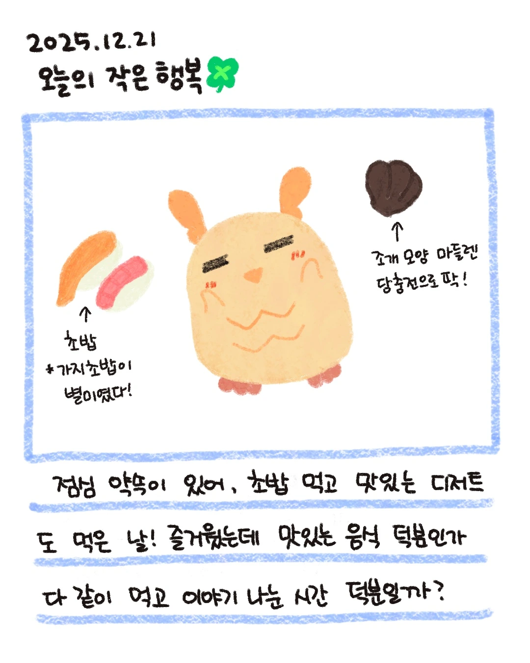 친구들과 약속이 있는 날이었다. 날이 정말 정말 추웠지만, 점심으로 먹은 초밥도 맛있었고 카페에서 먹은 디저트도 달달하고 맛있었다. 두런두런 이야기도 나누고 집으로 돌아온 길. '오늘의 작은 행복은?'이라는 질문에 바로 이 순간이 떠올랐다. 맛있는 음식 덕분일까, 이야기를 나눈 시간 덕분일까? 일기에는 저렇게 남겼지만 지금 생각해 보면..'나'를 위해 함께 하고 싶은 사람들과 맛있는 걸 먹고 이야기를 나눠서 인 것 같다. 이런 시간은 정말 필요한 것 같다.