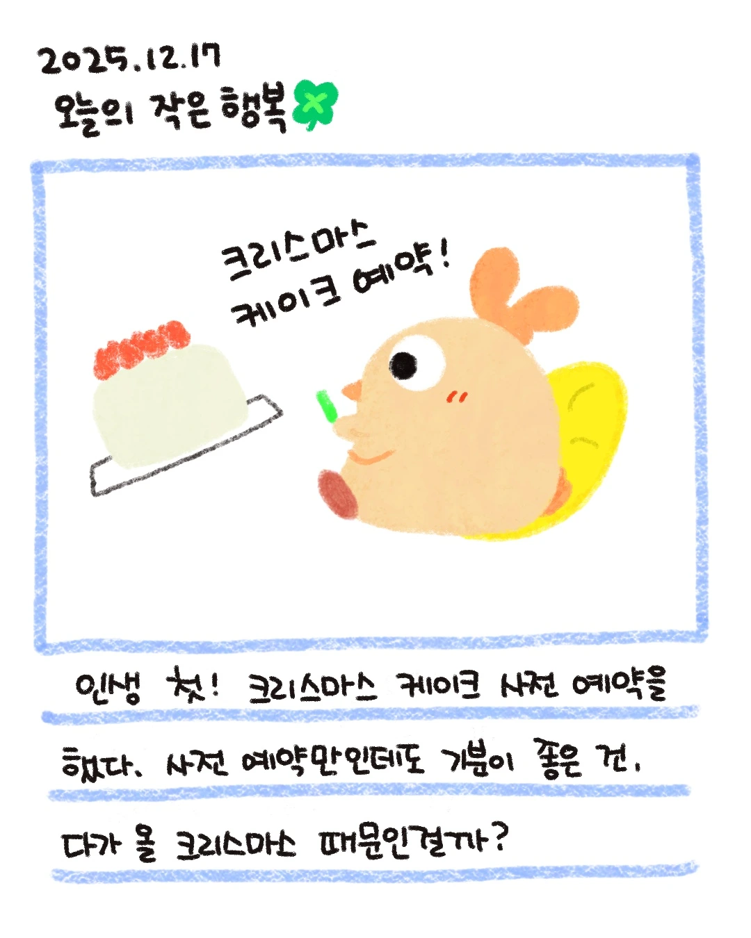 언젠가부터 크리스마스 케이크 사전 예약, 크리스마스 시즌에만 먹을 수 있는 케이크들이 자연스럽게 자리 잡기 시작했다. 디저트를 싫어하는 건 아니지만, 크리스마스 파티 같은 걸 잘하지 않아서 그냥 외식하기만 했었다. 그런데 예전에 감사한 분이 케이크 쿠폰을 선물로 주셔서 인생 처음 크리스마스 케이크를 사전 예약해 봤다. 그분이 아니었다면, 올해도 그냥 넘어갔었을지도 모른다. 신기한 게, 크리스마스 사전 예약이 뭐라고.. 같은 케이크인데도 괜히 설렜다. '크리스마스' 단어에는 행복이 숨어있는 마법의 단어일지도?!