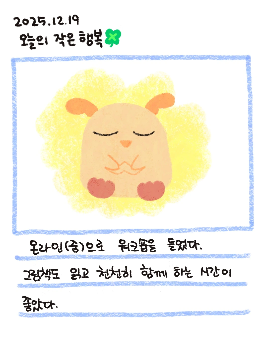 이전에 그림일기에도 언급됐던 그 워크숍을 오늘 들었다. 화면 너머로 참가자들을 배려하는 주최자분들의 배려심이 느껴졌고, 함께 읽었던 그림책도 좋았다. 기다려주고, 함께 해주는, 빠르지 않은 그 순간이.. 아마 편하게 내 마음을 내려놓고 바라볼 수 있는 시간이 된 것 같아서 행복했던 것 같다.