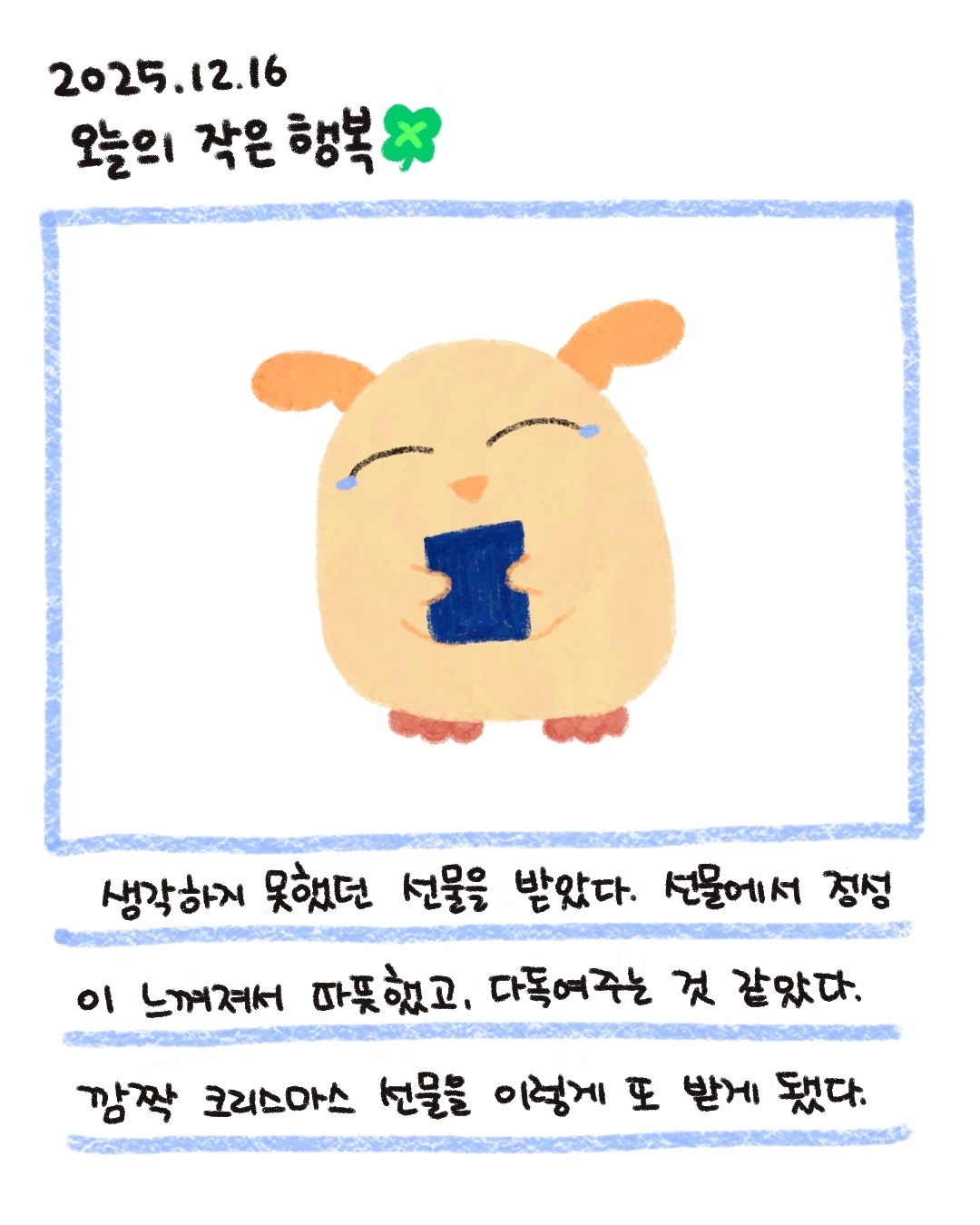예전에 워크숍을 하나 신청했었다. 온라인으로 진행되지만, 지역이 달라서 크게 기대는 하지 않고 있었는데 오늘 택배가 와서 받았는데, 그 워크숍 관련 기프트였다! 전혀 생각 못했는데 받아서 놀랬고 정성이 가득 담겨있는 게 느껴져서 마음이 따뜻했다. 이렇게 예상치 못한 행복은 내게 2배로 그 행복한 기분을 가져다주는 것 같다.