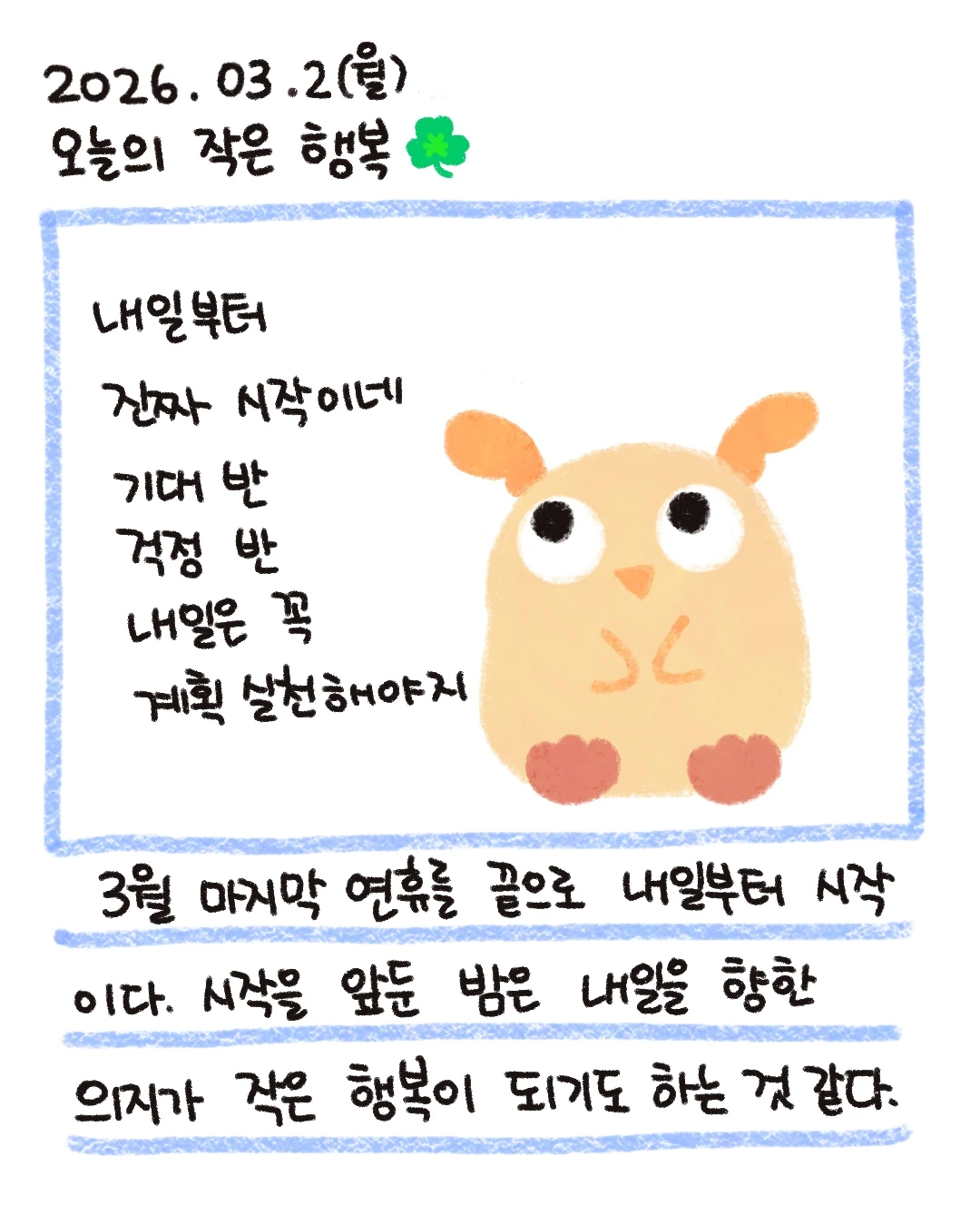 그래서 3월을 맞이하는 그 전날 밤에 기대와 희망을 안고 잠들었는데, 그것도 작은 행복이 될 수 있더라고요.
