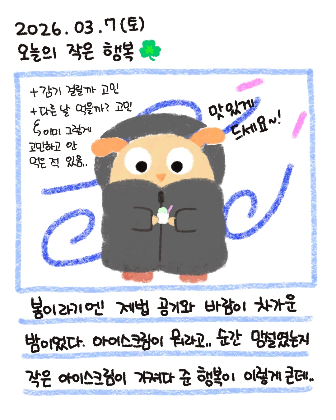 조금 다르긴 하지만, '함께', '같이'를 통해서 행복을 찾게 될 수도 있구나. 싶었답니다.