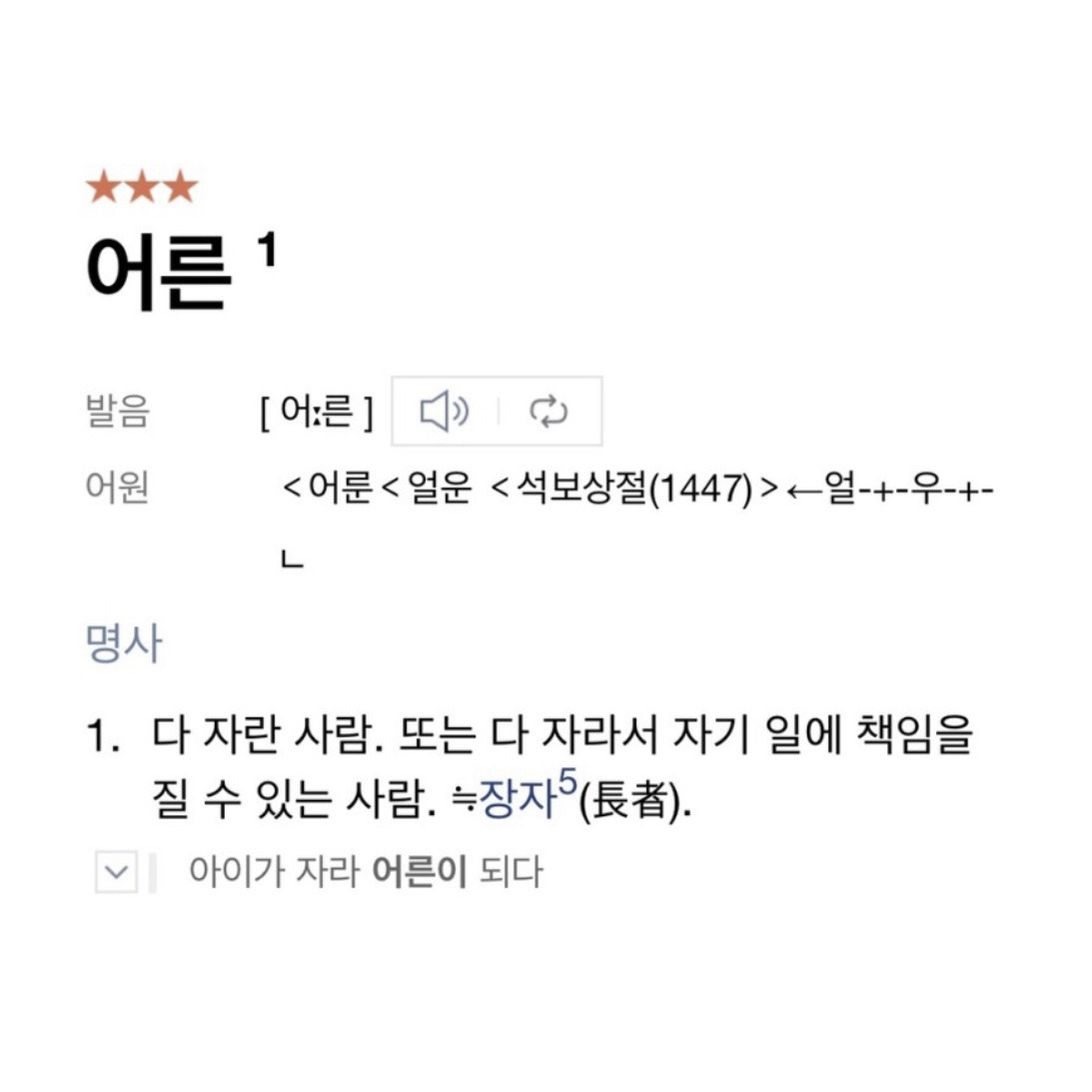 어느 적정선에서 평균적인 어른의 기준이 존재한다고 생각한다. 그렇기 때문에 비교적 신체적인 성장이 덜한 사람에게도 평균적인 어른의 기준선에서의 행동을 할 때 '어른스럽다' '다 컸네, 어른이네'라는 말을 하는 것이다. 그 말속에는 앞서 말한 어른의 정의처럼 자기 일에 책임을 질 수 있는 행동들에 대해 격식을 차려주는 의미가 포함되어 있을 것이다.