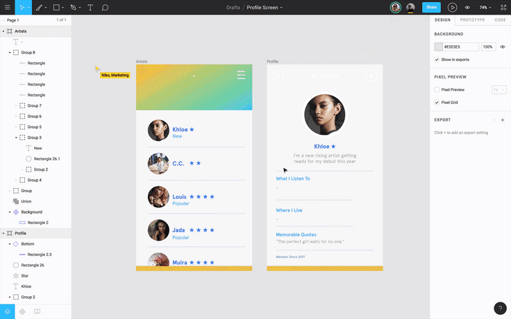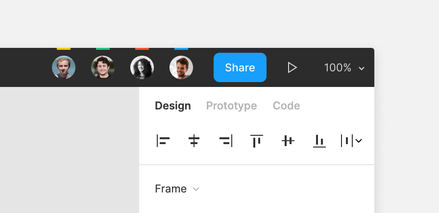 위의 가상 시나리오는 화상 회의 중에 종종 일어나는 상황이다. 화상 회의에 능숙한 회사와 고객이라면 이런 경우를 겪지 않을 수도 있겠지만 여전히 디자이너는 원격으로 디자인을 설명해야 하기 때문에 제약과 불편함이 존재한다. 반면 피그마를 이용할 경우 디자이너가 화상 채팅을 통해 화면을 공유하는 대신 각각의 회의 참여자가 웹으로 피그마 파일에 접속해 디자인을 살필 수 있다. 특히 회의 참여자가 디자이너의 프로필 아이콘을 클릭하면 디자이너가 커서와 화면을 움직이는 모습을 실시간으로 볼 수 있기 때문에 마치 디자이너의 어깨너머로 화면을 보면서 설명을 듣는 것 같은 효과를 누릴 수 있다.