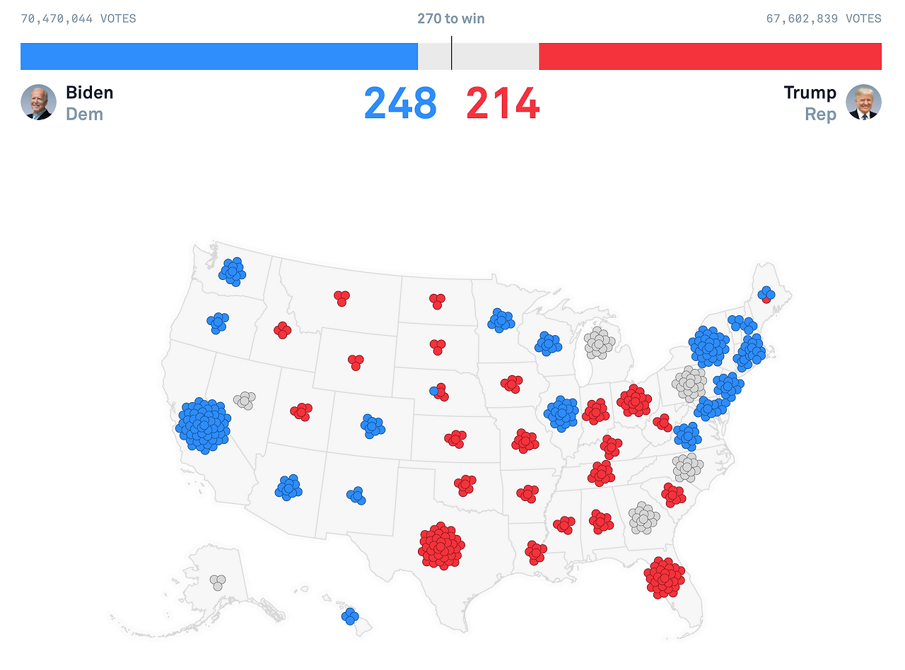 예를 들어 선거 다음날인 현재 캘리포니아에서는, 일반 시민 투표 결과 3백만 표 이상의 표 차이로 바이든 후보가 앞서가고 있다. 만약 이대로 캘리포니아 개표 결과가 바이든의 승리로 끝나면, 바이든은 캘리포니아 대리인 55명의 표를 모두 획득하게 된다. 이런 식으로 각 주의 대리인 표가 더해져 최종적으로 270표 이상의 대리인 표를 획득하는 후보가 대통령이 된다.