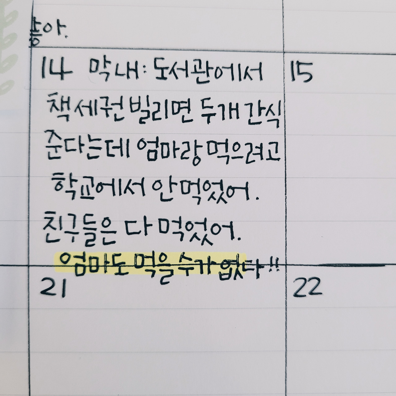 “엄마, 도서관에서 책 세 권 빌리면 간식 두 개 준다는데 엄마랑 먹으려고 학교에서 안 먹었어.