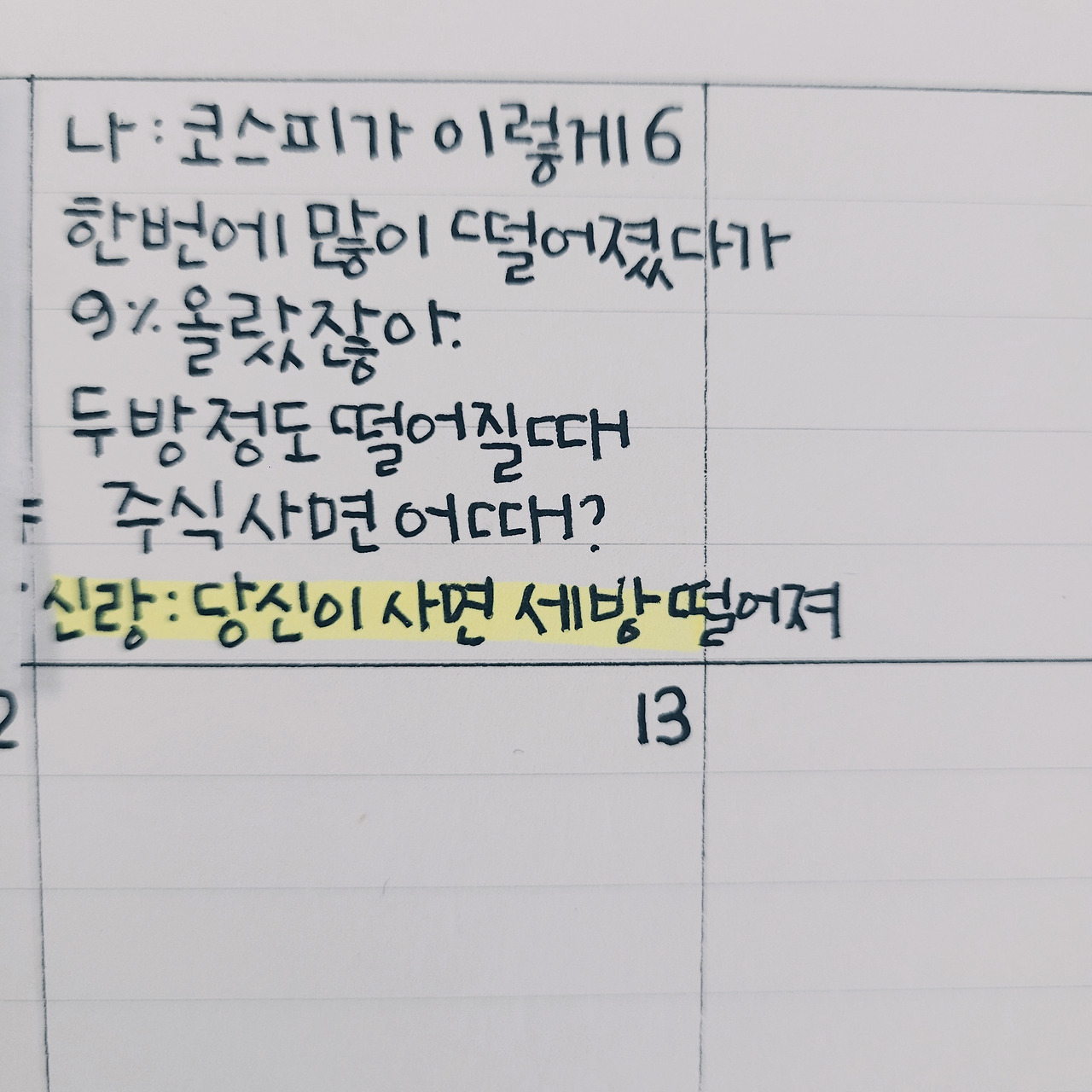 그런데 어제는 언제 그랬냐는 듯 시장이 9%나 급등하며 솟구쳤다. 어질어질한 변동성이었다. 폭락 뒤의 강한 반등을 보며 나는 무언가 깨달아 남편에게 비장하게 말을 건넸다.