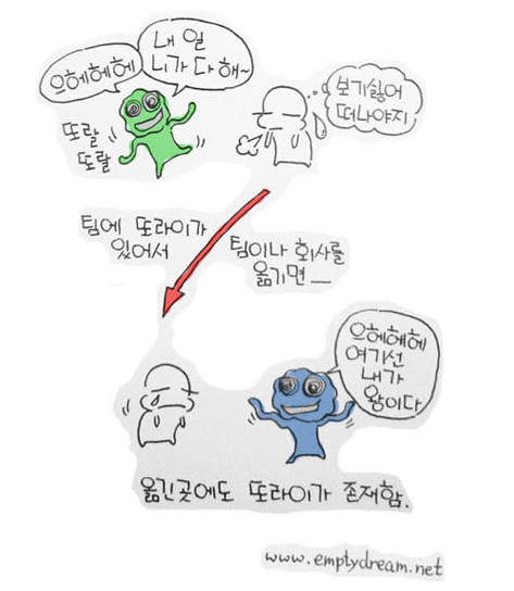 어느 팀으로 가나 또라이 한 두 명은 있다는 말입니다. 이직을 하던 팀을 옮기던 꼭 또라이 같은 사람이 한 두 명 있다 해서.