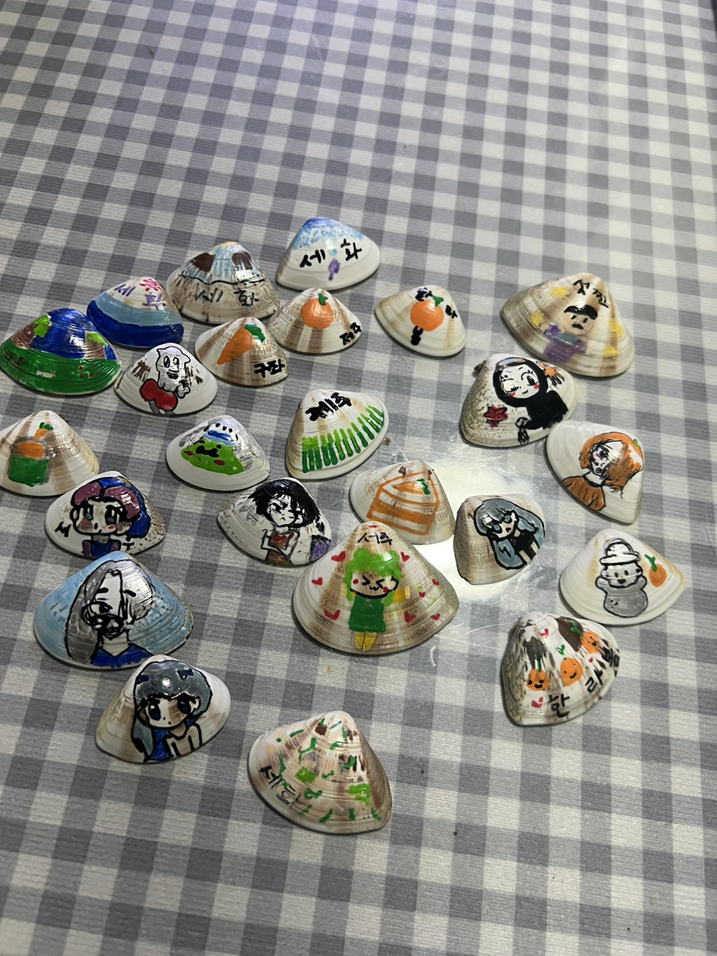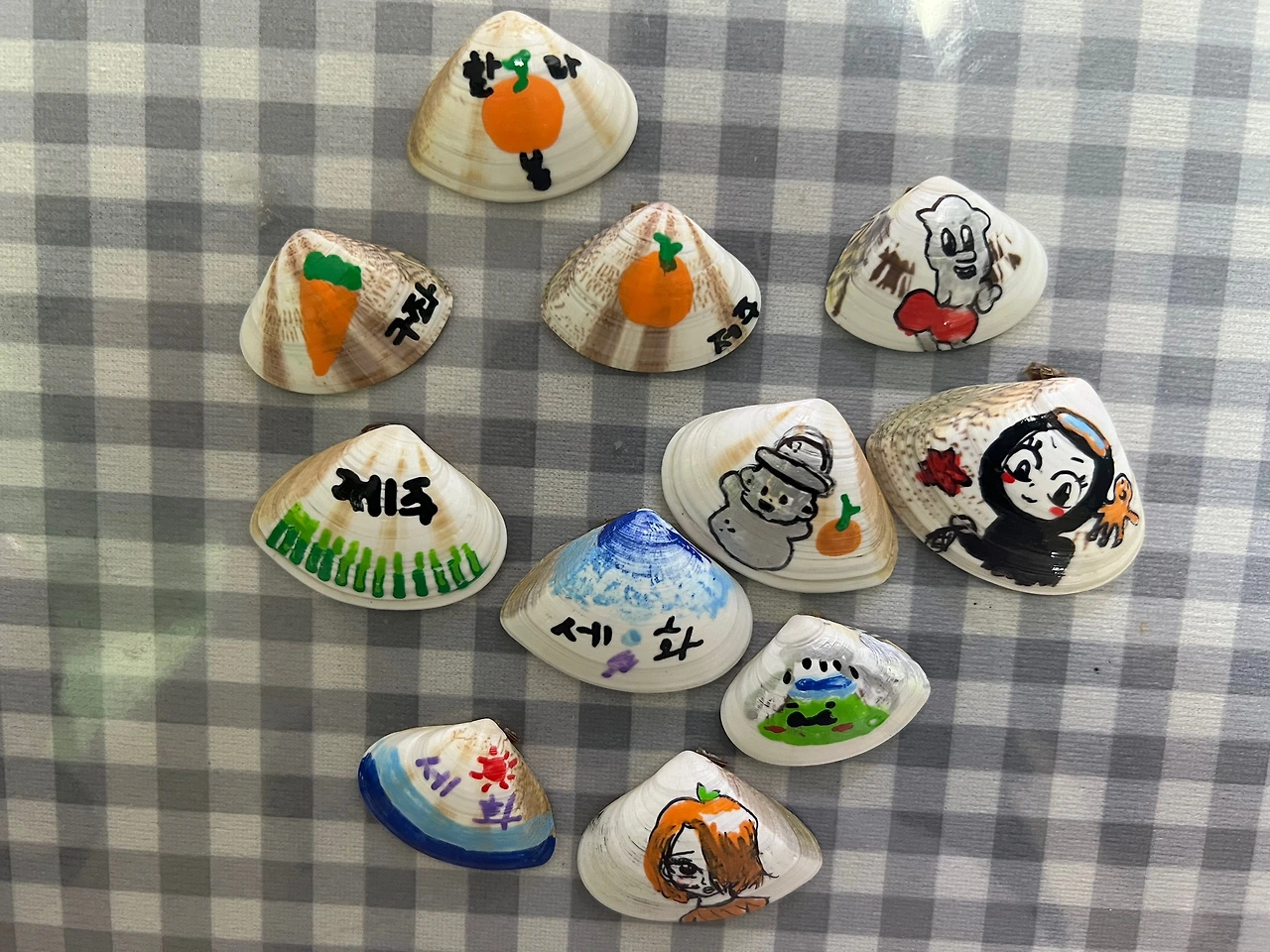 아이들에게 조개 위에 제주의 이야기를 그려보자고 했다. 아는 지인에게 조개에 그림을 그리고 싶은데 아크릴 물감을 사면 되냐고 물었더니 펜으로 그리는 게 낫다고 해서 펜을 구입해 열심히 한라봉, 한라산, 바다, 해, 해녀, 하르방 등을 그렸다. 생각보다 아이들이 너무 신나했고 보는 나도 뿌듯하고 즐거웠다. 아이들이 그린 그림을 보니 몽글몽글한 느낌이 든다.(나는 시범으로 하나를 먼저 그렸는데 제일 식상한 느낌이 든다.) 제주에서 돌아와서 제주를 추억하는 시간도, 그림을 그리며 웃고 아빠에게 조개를 보여주며 자랑하던 것도 우리 마음 행복 저장소에 저장!