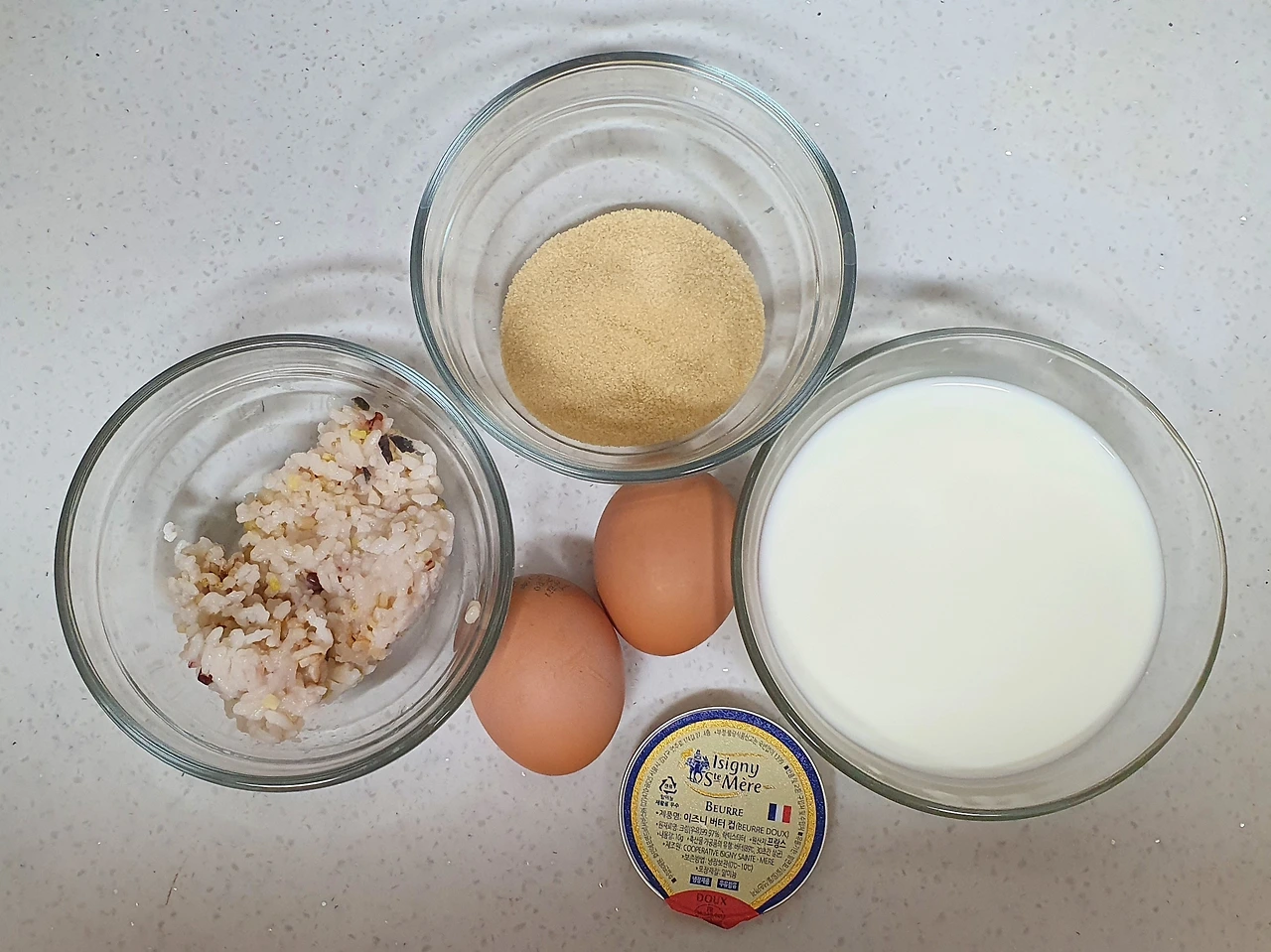 재료: 밥 100g, 설탕 50g, 우유 170g, 버터 10g, 달걀 1개