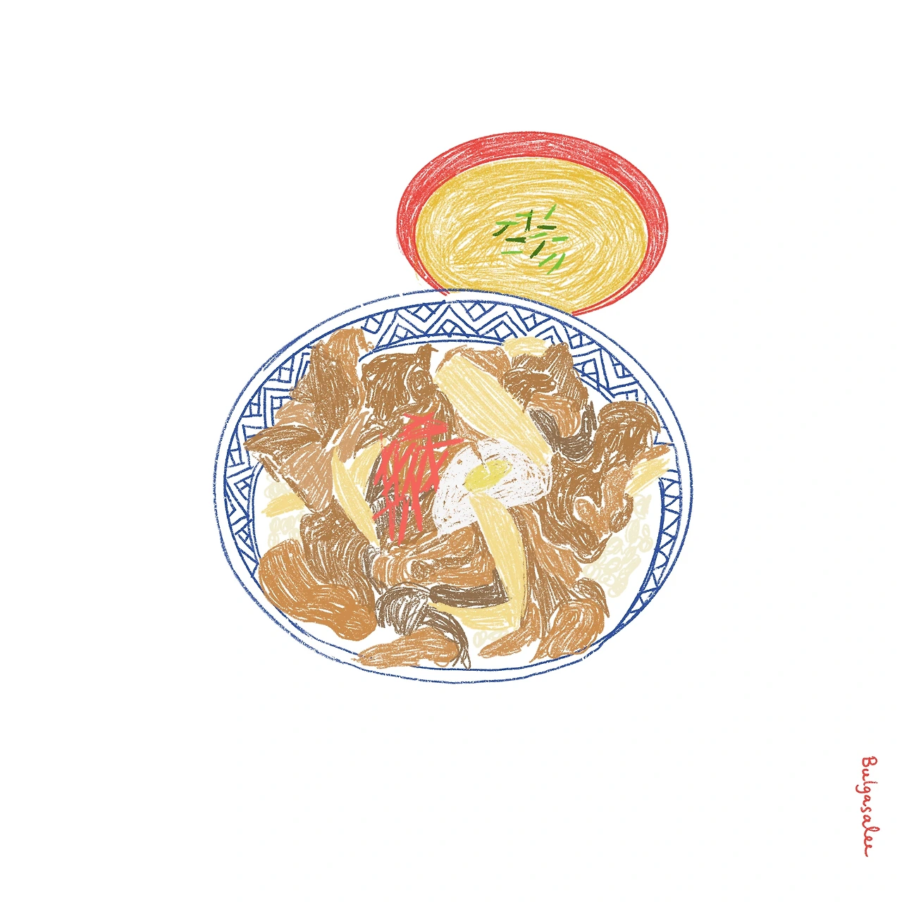 끼니를 챙겨 주는 따스한 말을 외국인 친구에게 듣게 되다니, 그 말에 마음이 사르르 녹았다. 우리는 아르바이트가 끝나고 자주 늦은 저녁을 먹었다. 햄버거와 치킨은 우리에게 밥이 아니었다. 그녀는 나를 근처 24시간 규동 전문점 <요시노야>로 데려갔다. 얇게 썰린 쇠고기를 쯔유에 졸인 달짝 지근한 덮밥, <규동> 온천 계란을 하나 추가하고, 분홍색의 생강을 살짝 얹어 먹으면 그 맛이 일품이었다. 일렬로 나란히 앉은 두 이방인은 수저를 쓰지 않고 양손으로 국그릇을 잡고 호로록 - 미소시루를 마셨다. 서로의 곁을 지키며 마호짱과 함께 먹은 한 끼의 규동, 따뜻한 미소시루 덕분에 그 해 도쿄의 겨울은 점점 따뜻해져 갔다.
