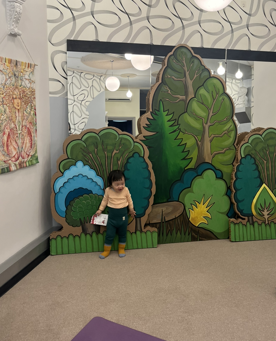 모든 궁금증은 오늘 요가 수업에서 밝혀졌다. 센터에 들어서자 18개월에 접어든 보름이는 신이 났다. ’ 우와우와‘를 연발하며 여기저기 걸어 다녔다. 작은 방의 바닥에 매트가 3개 펼쳐져 있었다. 요가 선생님은 아이들이 좋아할 만한 비눗방울을 꺼냈다. 비눗방울을 불자 아이들은 신기한 듯 바라본다. 아이들이 잠시 비눗방울을 보는 찰나의 순간, 우리에게 요가 동작을 설명한다. 들숨과 날숨을 반복하는 사이 비눗방울은 톡- 하고 터져버린다. 선생님은 또 다른 장난감을 꺼낸다. ‘아, 이런.. 저 장난감은 우리 집에도 있는 건데...’ 막대기를 끼우는 장난감에 보름이는 이미 본 것이라는 듯 길게 흥미를 가지지 않는다. 낯을 가리는 미르는 엄마인 샤샤의 품에 안겨있다. ‘선생님, 저희 오늘 요가를 할 수 있는 건가요?’ 데구루루 선생님이 또 다른 공을 굴리고, 아이들이 공을 줍는 사이 우리는 또 다른 동작을 시도한다. 그 외에도 부직포로 만들어진 트리를 들고서 한 발로 서 있으면 아이들이 와서 이것저것 붙이고, 떼어보기, 아이가 엄마 아래로 들어와서 ‘까꿍’ 하기 등... 요가의 작은 동작들 하나하나가 모두 아이와 연결되었다.