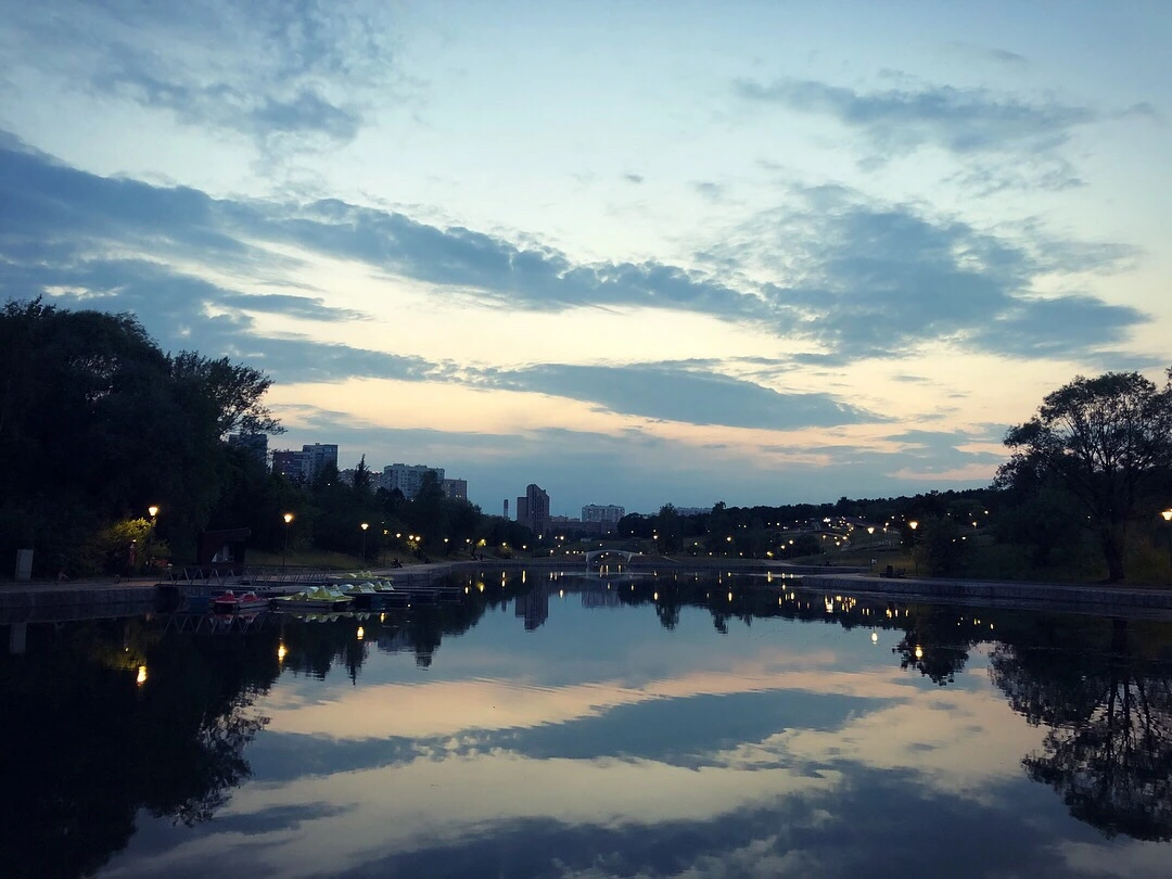 천천히 어두워지기 시작한 하늘에 떠있는 구름과 석양, 공원의 동그란 가로등이 호수에 환하게 비쳤다. 하늘과 호수는 학교 미술시간에 했던 데칼코마니처럼 완벽한 한 쌍을 이뤘다. 나는 학교에서 들었던 이태백의 이야기를 떠올렸다.