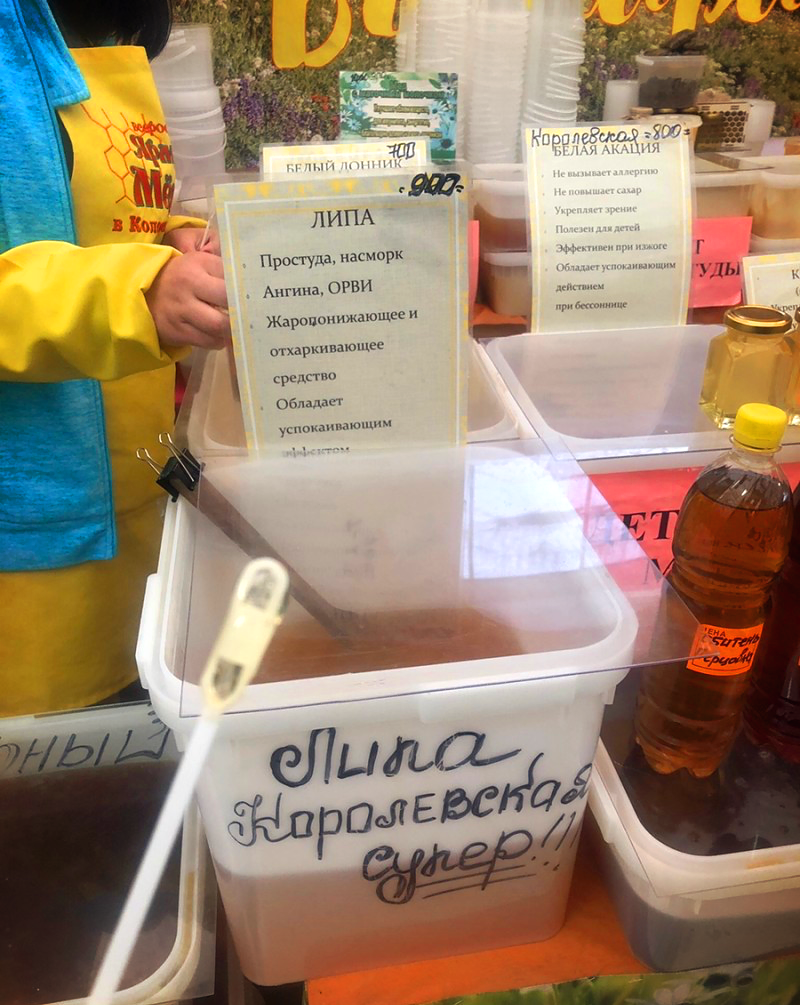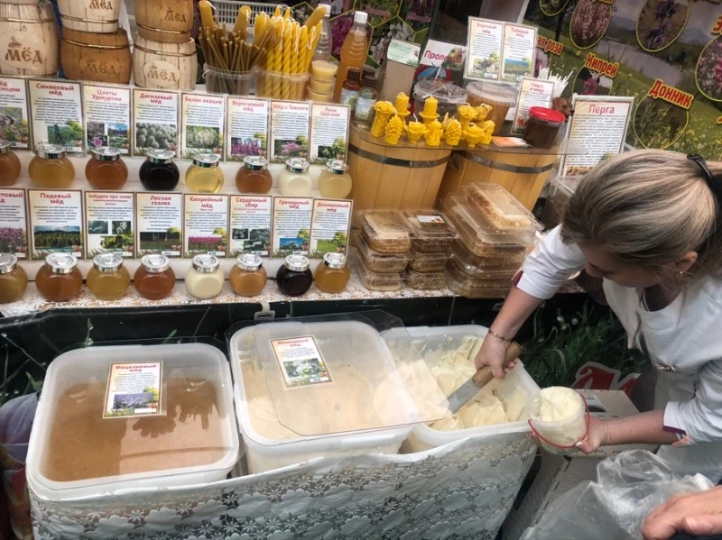 나 또한 한국에 갈 때마다, 무엇을 사면 좋을까 고민한다. 마트료시카 외에 유명한 것 중 하나는 ‘꿀’이다. 모스크바 동남쪽 깔라멘스꼬에 공원에서는 매해 8월 초부터 석 달간 대규모 꿀 시장(ярмака мёда в коломенском) 이 열린다. 러시아 전 지역에서 채집되어 올라온 다양한 종류의 꿀을 맛보고 살 수 있다. 우리에게 익숙한 아카시아 꿀부터 꽃 꿀, 메밀꿀, 밤꿀... 처음 보는 색과 질감의 꿀이 가득하다.