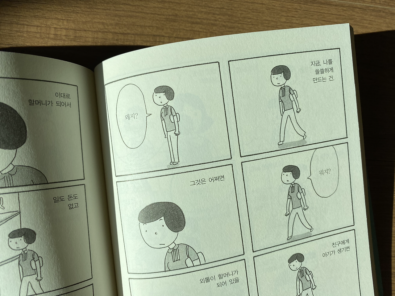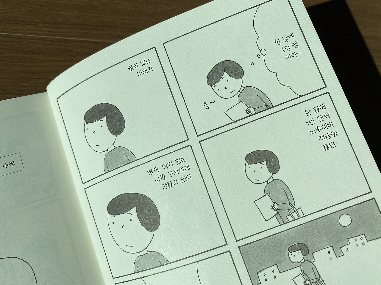 빨리 읽히는 만화책이지만, 쉽게 한 장을 넘기기 힘들 정도로 오랫동안 시선이 책에 머물렀다. 공감이 가는 구절이 많았다. 지금까지 내가 속으로만 생각했던 말들이, 활자가 되어 만화 속 인물들을 통해 내게 다시 돌아온다.