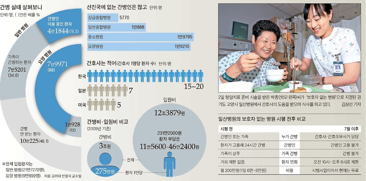 문재인 대통령은 정부 출범과 동시에 간호ㆍ간병통합서비스 확대를 통해 병원비 걱정 없는 나라를 만들겠다고 했다. 그러나 2013년부터 지금껏 시범사업의 수준에 머물고 있으며, 문재인 정부 들어서도 딱히 달라진 것은 없다. 예산 투입은 인색하고 보건복지부는 의료계 의해관계 충돌을 핑계로 이렇다 할 정책대안을 마련하지 못한 채 손을 놓고 있다. 정부는 안 되는 핑계를 찾을 것이 아니라, 도전적 정책의지로 할 수 있는 방안을 찾아야 한다. 지금의 병원은 환자의 고통이 가족의 고통으로 감염돼 확산되는 곳이다. 의료체계가 건강해야 환자와 가족들의 고통도 치유된다.