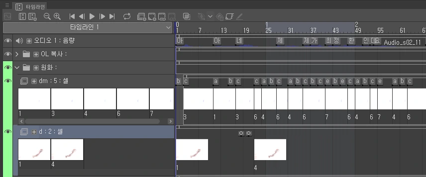 선녹음 파일이 나오고서 업무량이 급증했다. 우선 애니매틱 편집을 수정해야했다. 김삼신 캐릭터는 애니매틱과 다르게 매우 낮고 느린 톤으로 녹음했기 때문에 그에 맞춰서 컷길이를 늘렸다. 그러고서 그 녹음 파일을 컷번호대로 잘게 쪼갠다. 쪼갠 음성 파일을 각각의 작화 파일에 집어 넣어주고, 대사도 한음절씩 타이밍에 맞게 입력한다. 이런 자잘한 작업들을 모두 하고 나서야, 비로소 원화 그릴 준비가 되는 것이다.