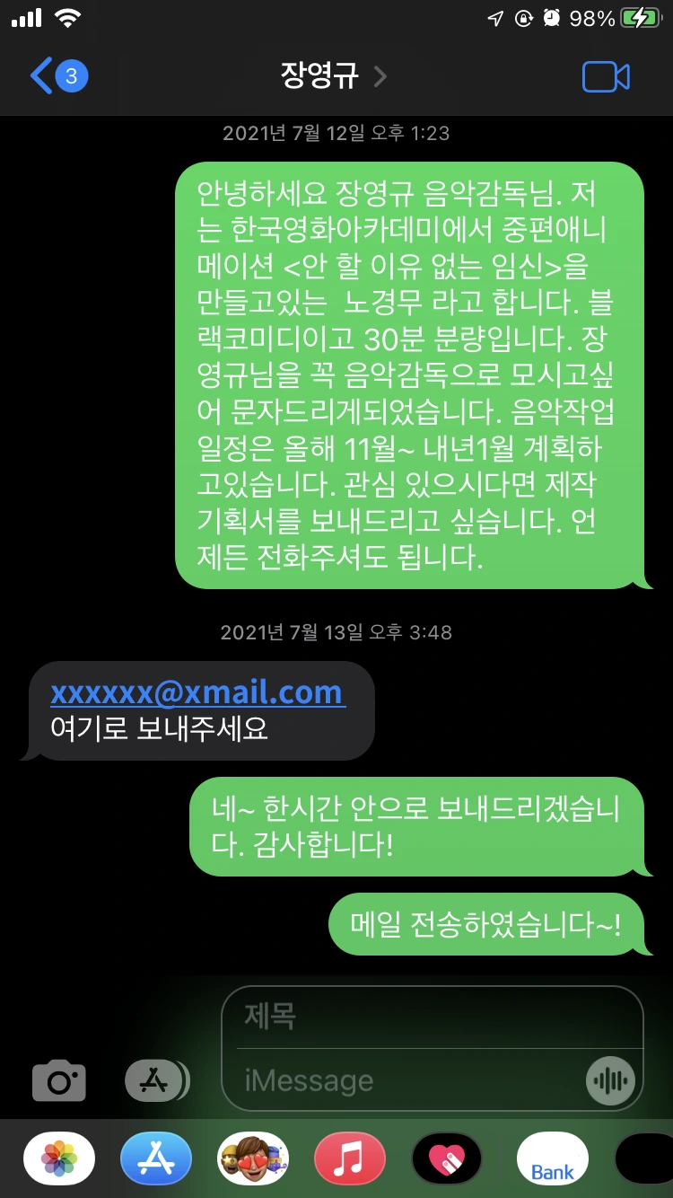 이제까지 생판 모르는 사람 여럿을 스탭으로 꼬셔왔지만, 이번 건은 규모가 달랐다. 차라리 장영규 감독님 SNS 계정주소를 알았다면 나았을까? 후. 전화부터 덥썩하는 것은 무례해 보일 수도 있으니까, 우선 예고장을 날렸다.