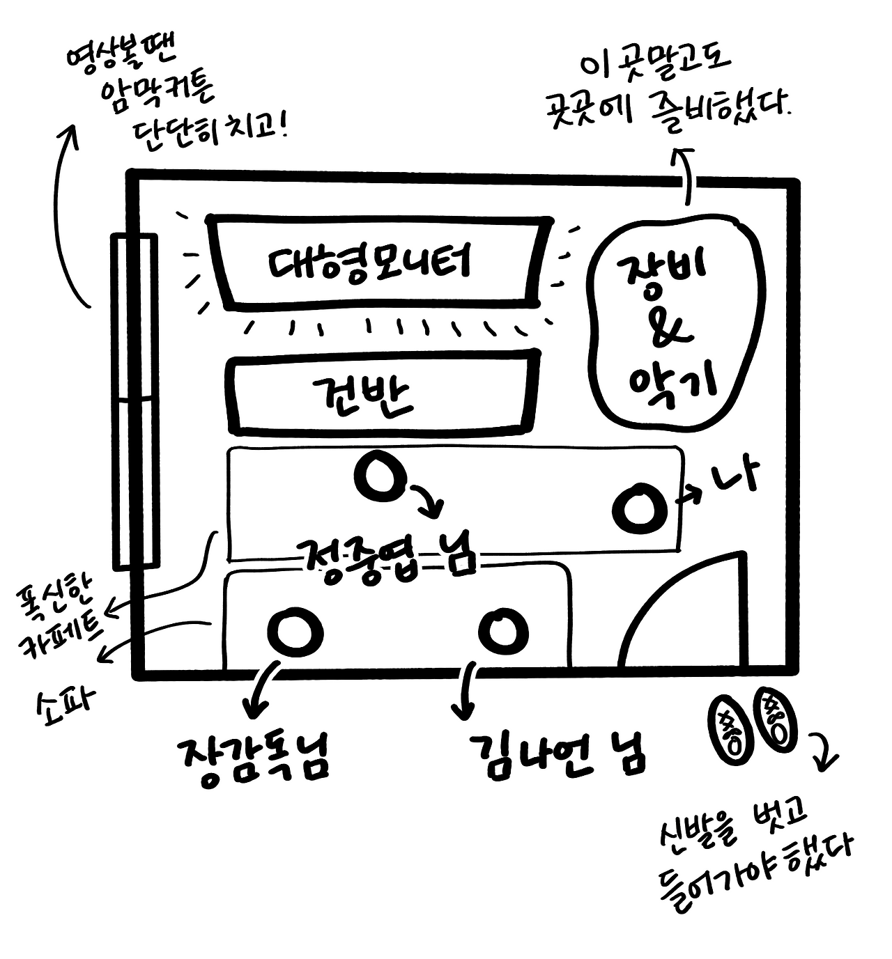 많은 영화감독들이 음악감독과의 의사소통을 어려워한다. 나도 마찬가지였다. 이미 주제곡 만들기에 실패하지 않았던가. 그래서 본격적인 음악 작업에 앞서 특훈을 하나 받았다. 한정인 음악감독님의 소규모 온라인 강의였는데, 거기서 얻은 교훈은 '음악 지식이 없어도 쫄지말고 자신의 언어로 잘 말하기'다. 그래서 나는 정말 쫄지않고 세 분의 작곡가님께 최선을 다해서 설명했다. 그 전에, 내가 무엇을 원하는지 알아야 했는데, 그래서 미팅 내내 엄청난 집중력이 필요했다. 음악은 작곡가가 다 만들어주는데 감독은 가서 듣기만 하면 되는거 아니야? 맞다. 그런데 진짜 열심히 들어야 한다. 2~3시간동안 이 음악이 'O'인지 'X'인지 가려내다보면, 미팅 끝에는 아주 기진맥진한 상태가 되고만다.