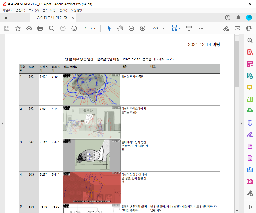 미팅에 앞서 표 하나를 짰다. 이런 표를 뭐라고 불러야 할지 모르겠는데, '예상' 큐시트라고 해야할까? 음악이 필요한 부분을 정리한 표였다. 이 표대로 영상을 스킵하면서 감독님과 애니매틱을 훑었다. 한 시간 내내 혼자 떠들었다. 각 씬이 어떤 내용인지, 누가 주인공인지, 어떤 음악이 필요한지 등을 설명했는데, 아마 횡설수설했을 것이다. 그런데도 감독님은 잠자코 듣고만 계셨다. 정말 듣기만 하셨다. 그때는 그런 반응이 조금 혼란스러웠다. 감독님이 내 말을 잘 듣고 계시는지, 무슨 생각을 하고 계신지 알 수 가 없었기 때문이다. 그렇게 일방적으로 하고싶은 말을 모두 쏟아낸 후, 첫 미팅이 얼레벌레 끝났다.
