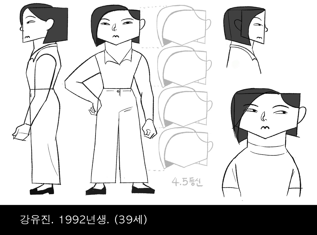 캐릭터 디자인은 시나리오를 쓸 때부터 생각하긴 했다. 우선 내가 쉽게 이입할 수 있는 유진이부터 상상해봤다. 우선, 팔다리가 빼빼 마른 여자를 그리고 싶지 않았다. 마블처럼 가슴과 엉덩이가 풍만한 캐릭터도 싫었다. 박세리 선수 같은 몸과 카리스마를 가지면 좋겠다고 생각했다. 개그우먼 박나래의 체형도 참고했다. 연애시절에는 긴 머리였겠지만 결혼하고서는 칼 단발을 유지하는 커리어우먼을 상상했다.