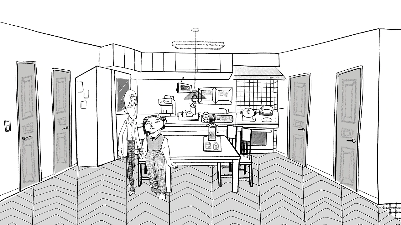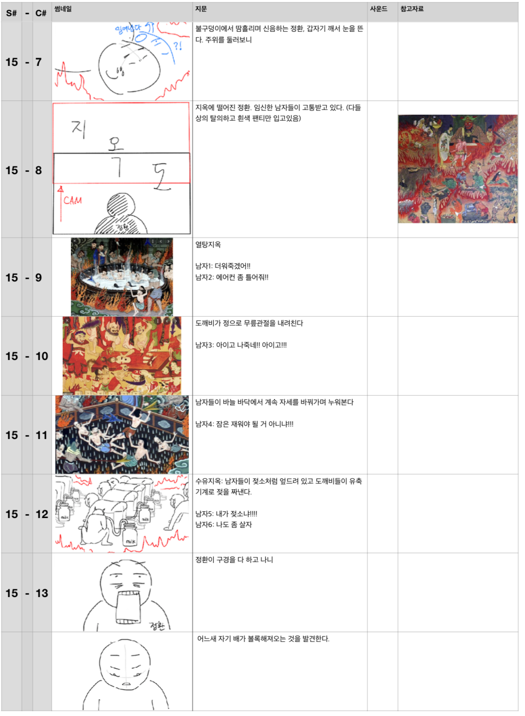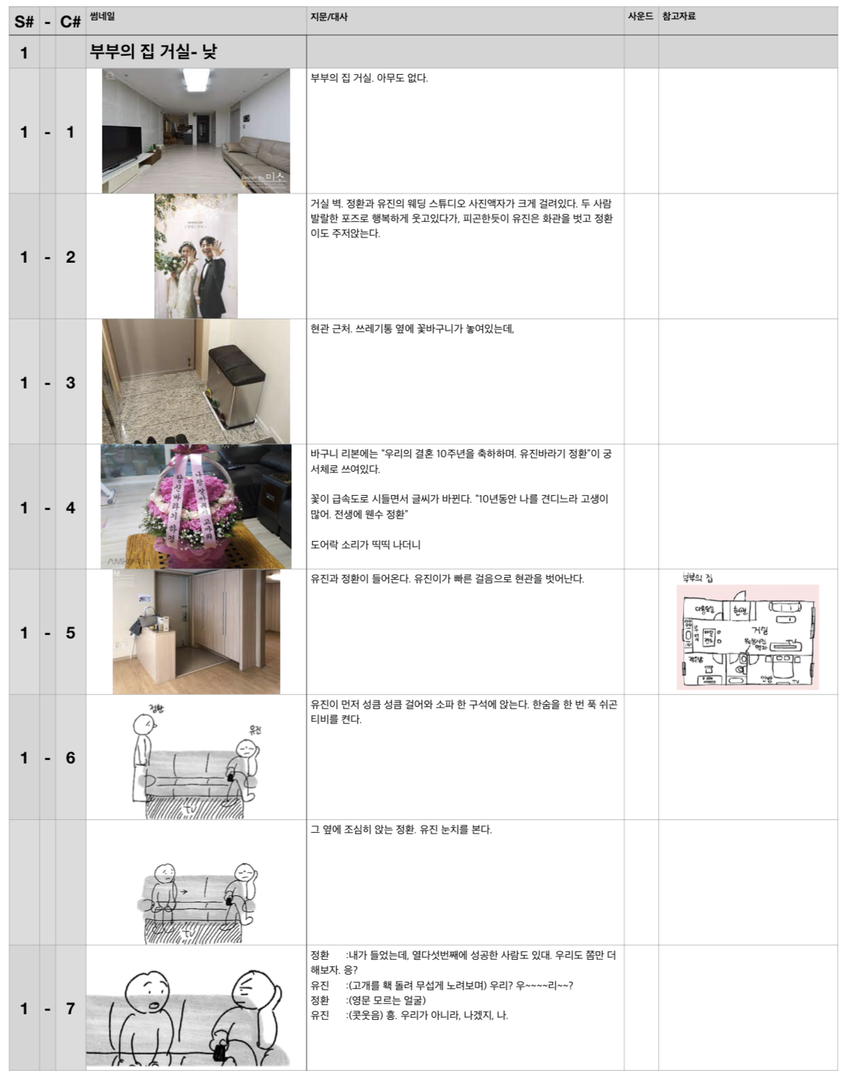 그런데 막상 콘티를 시작하려고 하니, 공간 디자인도 없어서 난감했다. 일단 인터넷에서 찾은 아파트 사진을 붙여 넣으면서 시작했다. 시작하고 나니, 자연스럽게 주인공 부부가 사는 아파트 평면도를 그리고 있더라. 엑스트라가 필요할 때는, 연예인 사진을 갖다 넣기도 했다. 장면을 잘 그려낼 자신이 없을 때는 레퍼런스 미술 자료를 고대로 붙여 넣기도 하고.