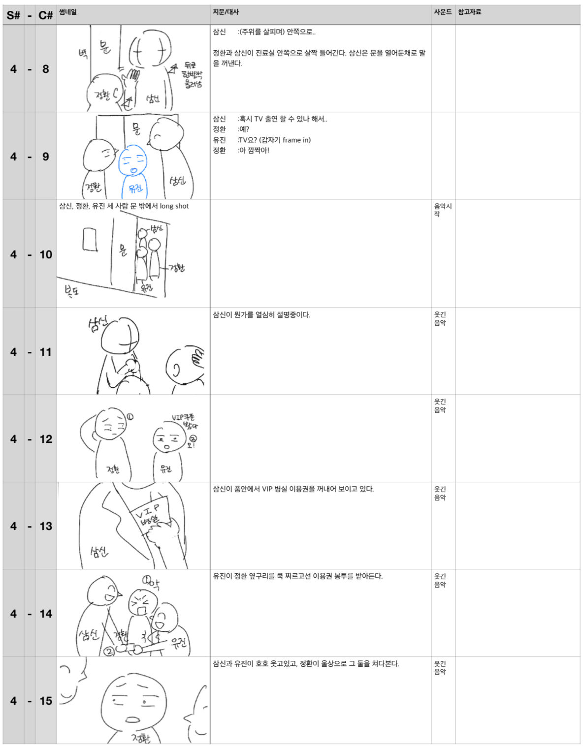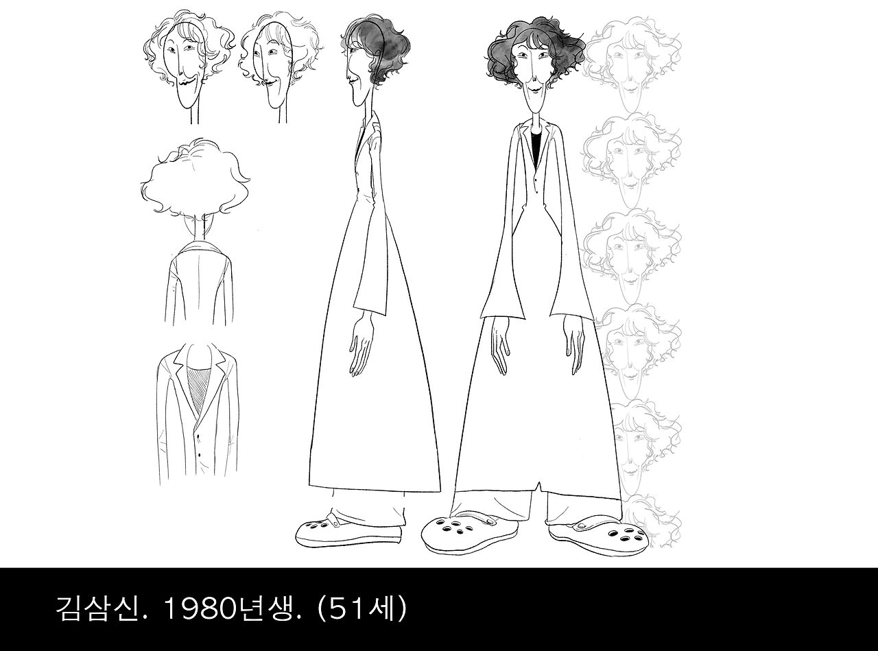 소희 작가에게 해당 연예인 사진을 찾아서 전달했다. 소희님은 일주일 만에 김삼신 박사를 뚝딱 그리더니, 유진도 일주일 만에 뚝딱 그려냈다. 소희님이 러프 스케치를 한 장 한 장 보여줄 때마다 우리는 박수를 치며 좋아했다. 정환이는 시간이 좀 걸렸는데, 이건 내 잘못이 크다. 시나리오를 다 썼는데도 정환이 야비한 마초인지, 그냥 어리바리한 놈인지 헷갈렸기 때문이다. 솔직히 말하면 지금도 헷갈린다.