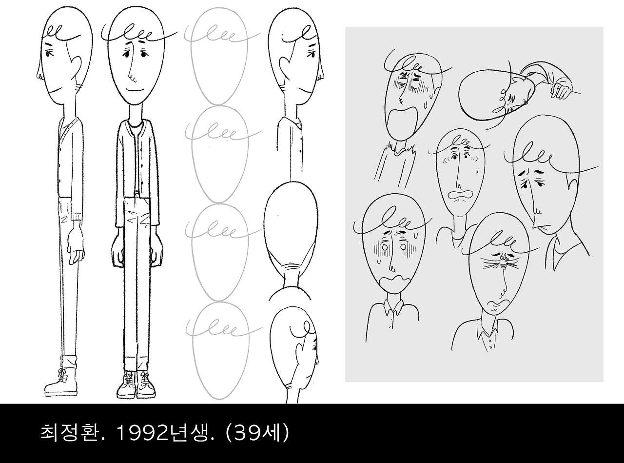 반대로 정환이는 키가 크고 호리호리한 체형이었으면 했다. 영업직에서 일할만한, 누구에게나 좋은 인상을 주는 훈남 스타일. 그러나 개성과 카리스마가 없는 얼굴을 원했다. 나중에 안 거지만, 이런 캐릭터를 그리기가 가장 어렵더라.