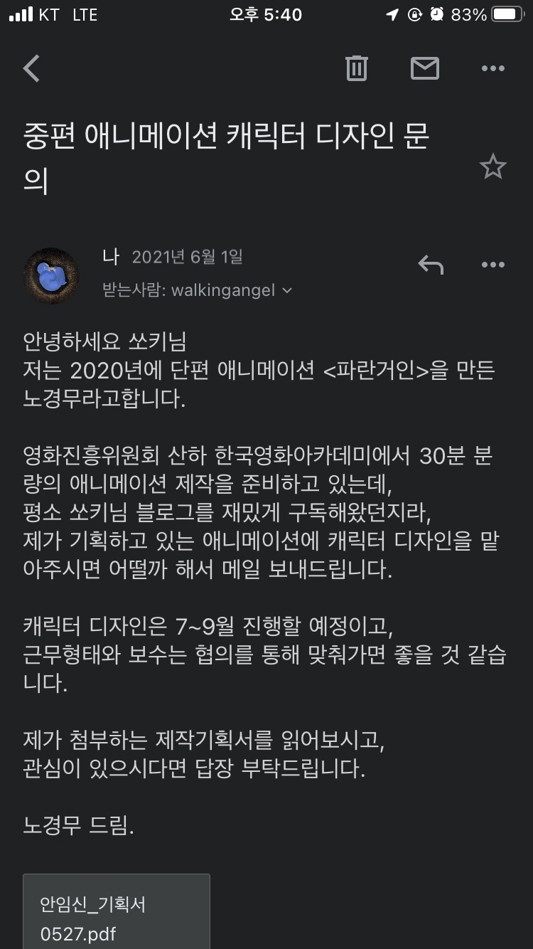 우선 캐릭터 디자이너부터 찾기 시작했다. 처음엔 어디서 어떻게 구해야 할지 막막했다. 인스타그램, 트위터 등지에서 그림 좀 그린다 하는 사람들을 다 뒤져봤는데, 의외로 다른 곳에서 쉽게 결정했다. 나는 전부터 동경하던 작가님에게 메일을 보냈다.