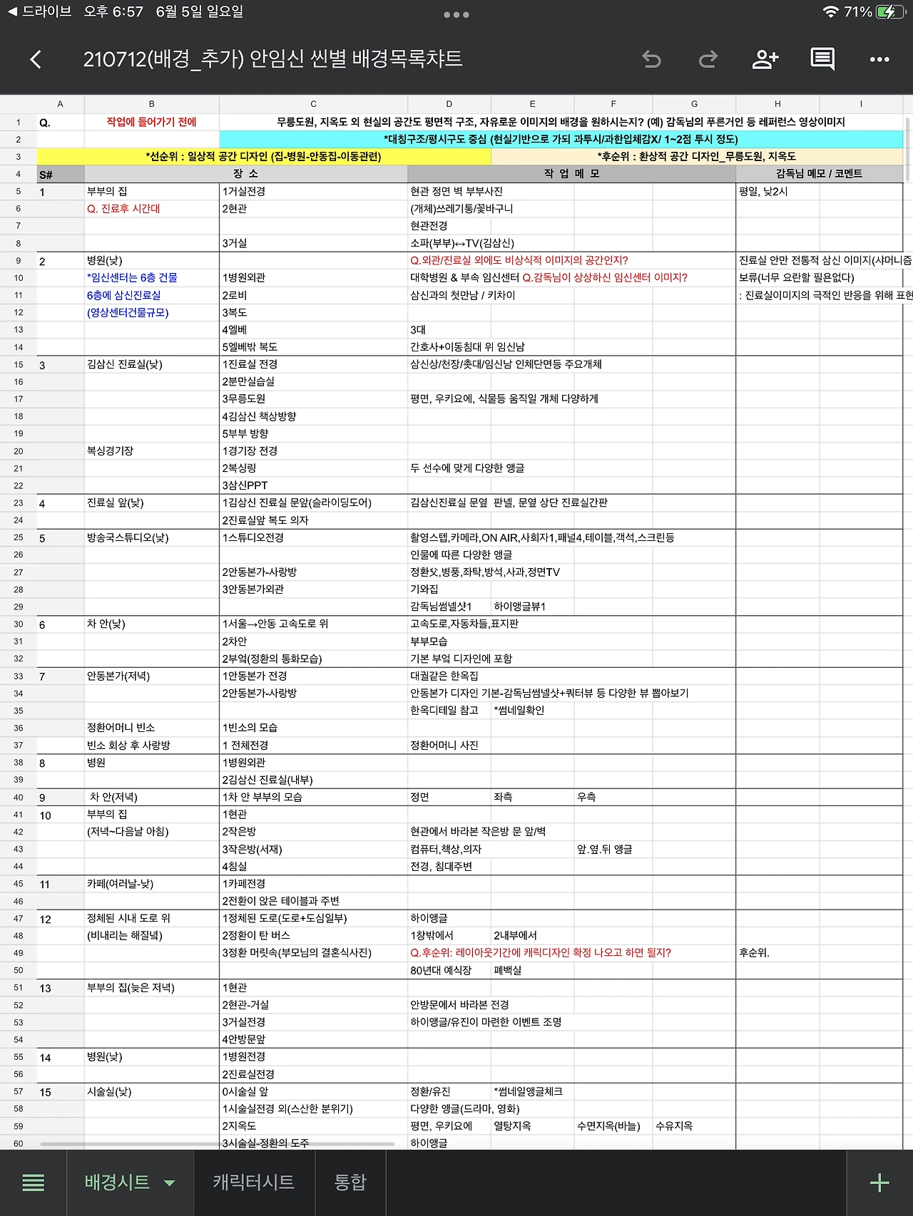 신이슬 작가는 시나리와 콘티를 기반으로 배경 목록부터 작성했다. 그 디테일에 다들 혀를 내둘렀다. 여러 가지를 질문해주신 덕분에, 내 머릿속에 희미하게만 있었던 공간들이 점점 뚜렷해졌다.