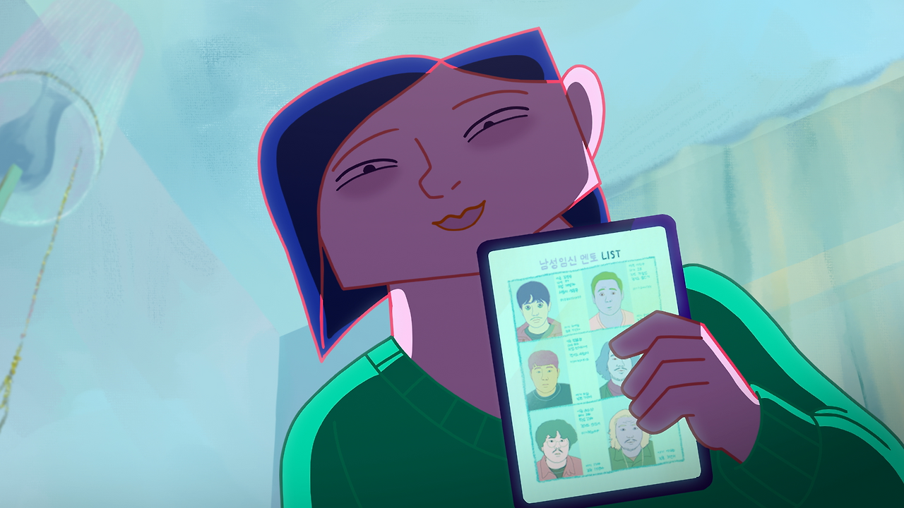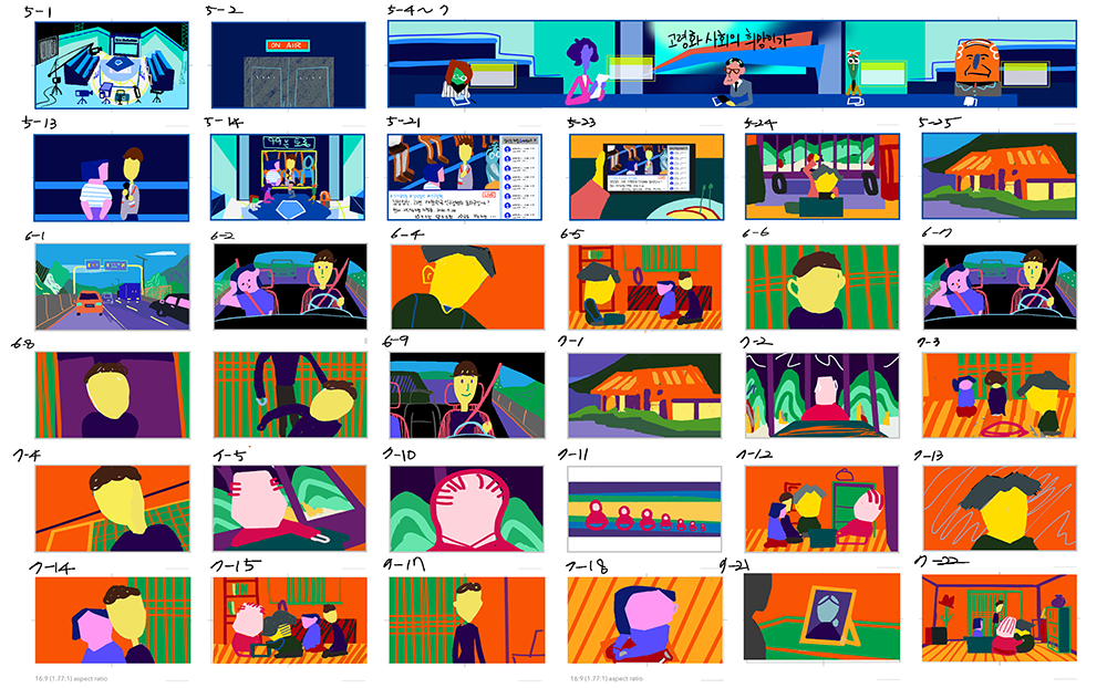 나는 인물의 피부색이 일반적인 상아빛이 아니기를 바랐다. 시나리오를 다 썼을 즈음, 나는 그냥 막연히 여자주인공 유진의 얼굴을 하늘색으로 설정했었다. 솔직히 말하면 입신양명에 눈이 멀어서, 어디에서 상이라도 받으려면 무난한 아트로는 어림도 없다는 생각에 그랬던 것이다. 그래서 또 인스타그램을 탈탈 털었고, 한 눈에 사람을 사로잡는 색깔을 쓰는 그림책 작가 한세희씨를 미술감독으로 섭외했다. 그리고 세희씨가 설계한 컬러스크립트를 기반으로 완성 스틸컷을 하나하나 그려나가기 시작했다.