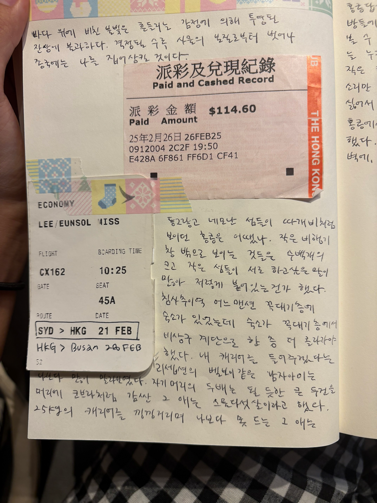 홍콩에서 지낸 일주일은 시간이 너무 느리게 가 나는 갈수록 축축한 이불 같았다. 호주에서 보냈던 시간들에 묶여 매일 밤 자기 전 사진첩만 죽죽 내려대며 얼른 오늘과 내일이 지나가기를 기도했다.