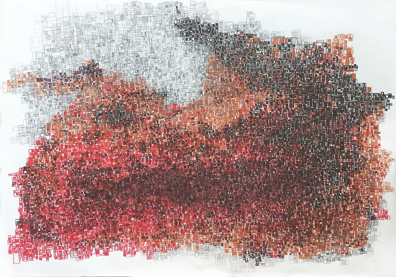 between atoms and atoms-sunset(노을), 59.4 x 42 cm, pencil and markerpen on paper, 2018