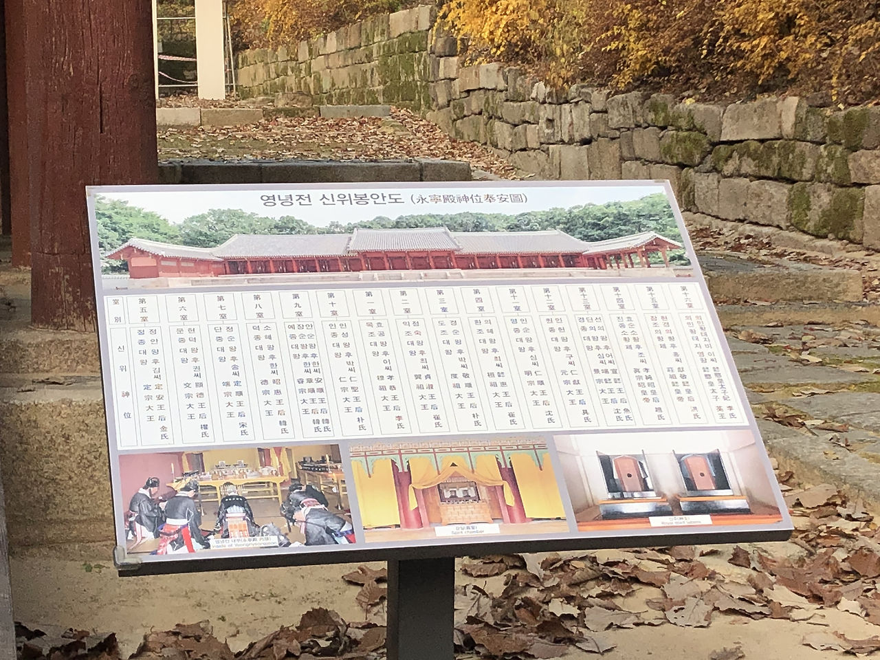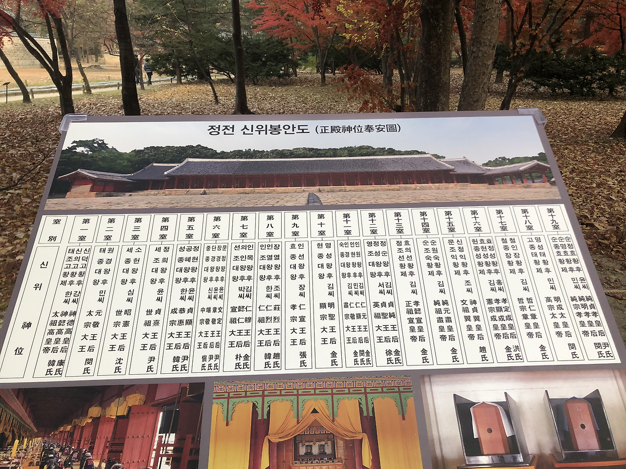 정전은 참으로 길~~~다. 원래 예법이라면 4대까지만 제사를 올려서 정전의 방이 이거보다 작았다고 한다. 그런데 하나 둘 업적을 남긴 왕이 많아서 증축했다고 한다. 참 재밌다