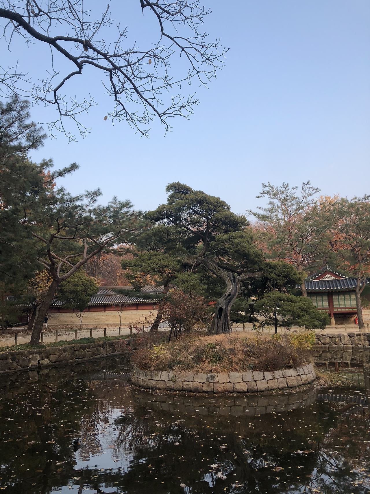 청둥오리 암수가 여유롭게 못 안을 노니고 있다. 연못은 사각형인데 향나무를 심어놓은 가운데는 원형이다. 이는 천원지방, 하늘은 둥글고 땅은 네모다라는 사상이 반영된 것이라고 한다. 굵은 결이 구불구불하고 단단하게 서있는 향나무는 왠지 모르게 근엄한 느낌을 준다.