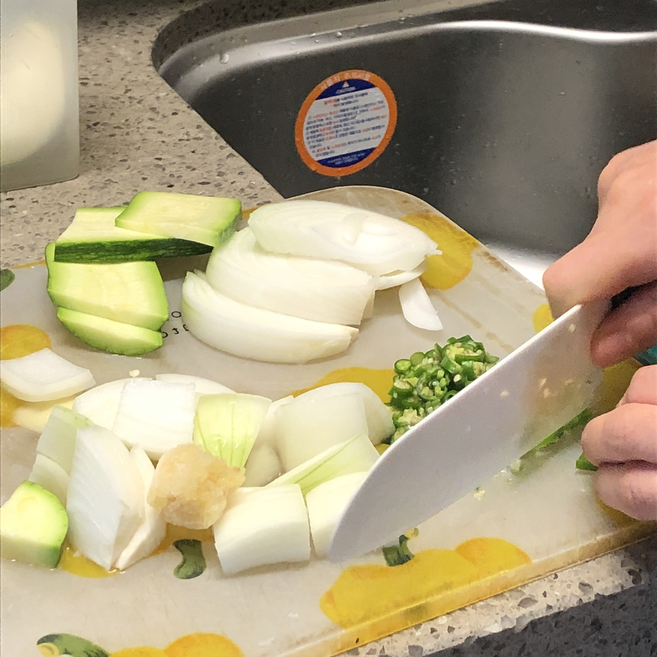 장기간 버스를 타고와서 좀 허기가 졌기에, 나도 옆에서 재주를 부려본다. 된장에 들어갈 것들을 썰어본다. 셰프는 엄마이기 때문에 깍뚝썰기 할까요 얇게 썰까요 다 물어봐야 한다. 나름 자취하면서 늘어난 칼질 솜씨덕에 엄마의 "아휴~" 소리는 사라졌다. 점점 혼자 할 수 있는 게 많아지는 건 참 뿌듯하면서도 섭섭하다.