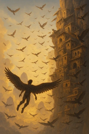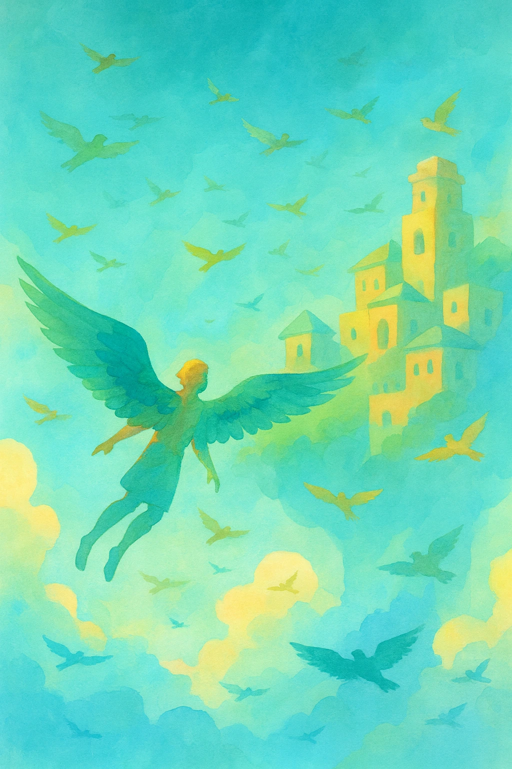 AI: 좋아. 네가 그린 “거대한 하늘 부족”과 주제가 통하는 인간의 예술 작품들을 시대·장르별로 딱 맞게 골라봤어. (핵심 키워드: 날개 달린 인간, 하늘/부유 도시, 천상 전투, 추락-상승의 서사)