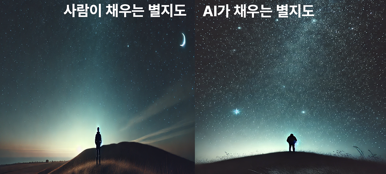 개인적으로 저는 이 글에서 무엇이 저의 저작권인지 모르겠습니다. 이 글의 생각과 가치도 이전에 존재하던 지식들로부터 생겨난 하나의 별이라고 생각하거든요. 마찬가지로 AI가 만들어 내는 지식들도 이전 지식들로부터 관계를 파악하고 조합한 결과라면, 나의 별과 그의 별이 다르지 않을지 모릅니다. 문제는 우리가 만들 수 있는 별의 개수보다 AI가 채울 수 있는 별의 개수가 훨씬 많다는 점입니다.
