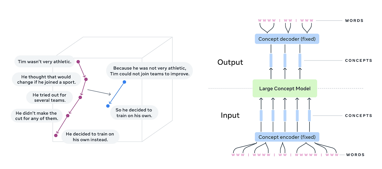 Concept에 대한 순차적 생성 지금까지 AI 모델은 단어를 하나씩 순차적으로 생성하는 방식으로 학습되었습니다. 그러나 최근 Meta에서 발표한 논문은 개념을 순차적으로 생성하는 방식을 제안했습니다. 이는 인간이 생각의 흐름을 개념적으로 연결한 후, 이를 묘사하는 단어를 선택하는 것과 유사합니다. 어쩌면 AI는 인간의 뇌가 상상할 수 있는 개념보다 훨씬 더 많은 개념을 연결하고 확장할 수 있을지도 모릅니다.