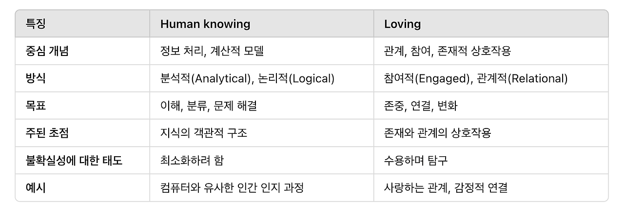 대상을 만들어야 한다는 틀에서 벗어나 오늘 주목할 새로운 인지 방식은 Human Knowing 이라고 불립니다. 인지과정이 타인을 고려하고 관계를 맺는 과정을 포함한다는 개념입니다.