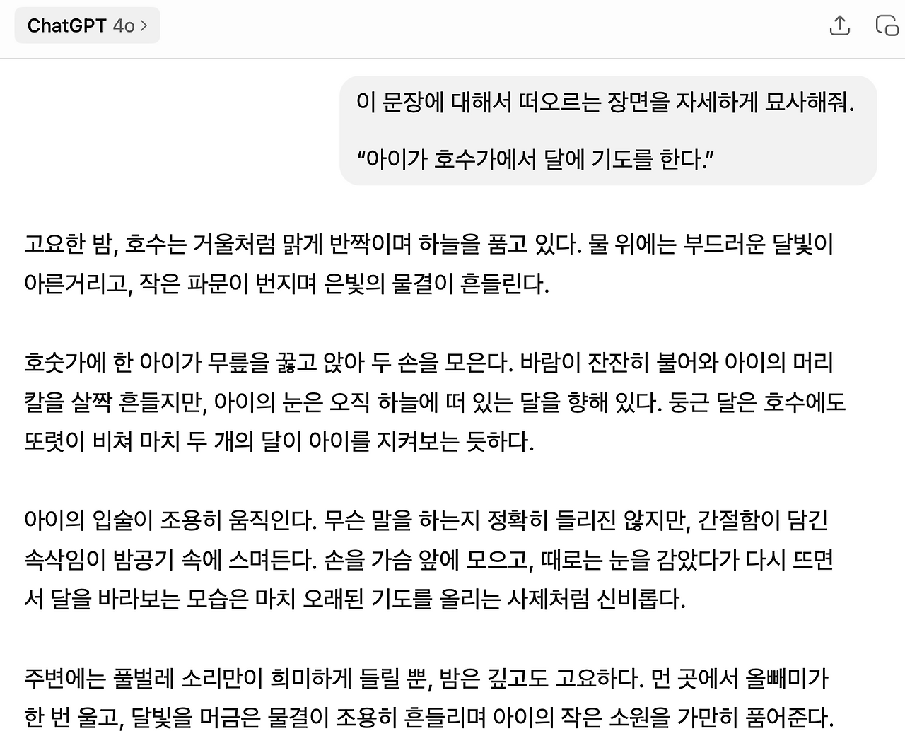 수많은 AI 로봇이 존재하는 미래에서, 그들은 심볼을 통해 어떤 장면을 떠올릴까요? 로봇도 인간처럼 심볼과 관련된 것들을 상상할까요? 아래는 ChatGPT의 상상입니다. 그는 무릎을 꿇고, 보름달을 보고 있다고 생각했어요.