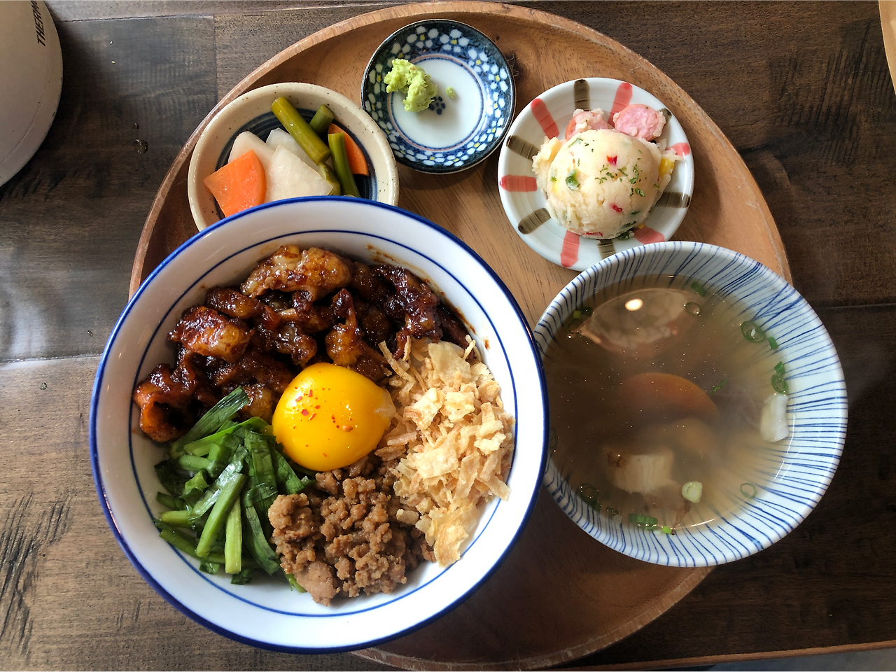 이런저런 생각을 하다 보니 곱창 덮밥이 나왔다. 나무로 만든 쟁반에 곱창 덮밥과 야채로 만든 피클, 고추냉이, 감자 샐러드, 파가 송송 썰려 둥둥 떠있는 어묵 국물이 함께 나왔다. 덮밥에는 계란 노른자, 부추, 고기 고명과 튀긴 마늘 및 양파 그리고 이 메뉴의 핵심인 곱창이 가지런하게 밥 위에 올려져 있었다.