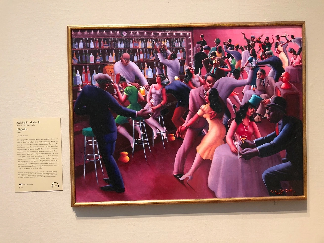 개인적으로 가장 인상 깊게 보았던 작품은 아치볼드 모틀리(Archibald Motley)의 나이트라이프(Nightlife, 1943)이다. 우선 색감이 좋았고 카바레안에 있는 사람들의 역동적인 모습이 인상 깊었기 때문이다. 개인적으로 정적인 것보다는 동적인 것을 좋아하는 개인 성향이 묻어나서 인상깊게 느껴진듯하다.