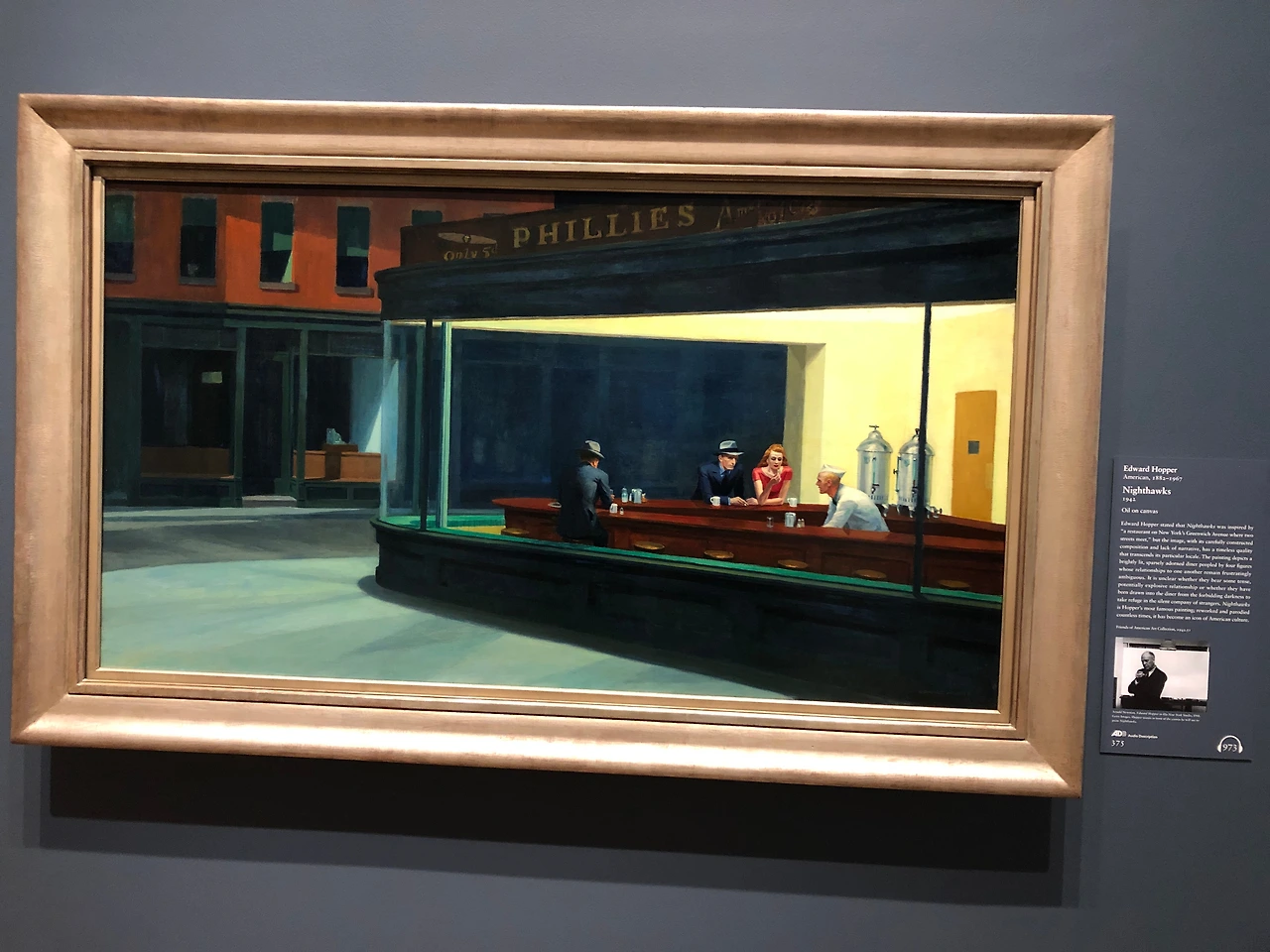 다음은 미술관에서 가장 미국적인 느낌을 받았던 에드워드 호퍼(Edward Hopper)의 밤의 사람들(Nighthawks, 1942)이다. 에드워드 호퍼는 미국의 화가로 뉴욕 주 나이아크에서 출생하여 뉴욕에서 사망했다. 뉴욕 미술학교에서 헨리에게 사사했으며 양차 대전 사이에 도시민들의 삶을 특징지었던 고독감, 절망감을 표현하였다.