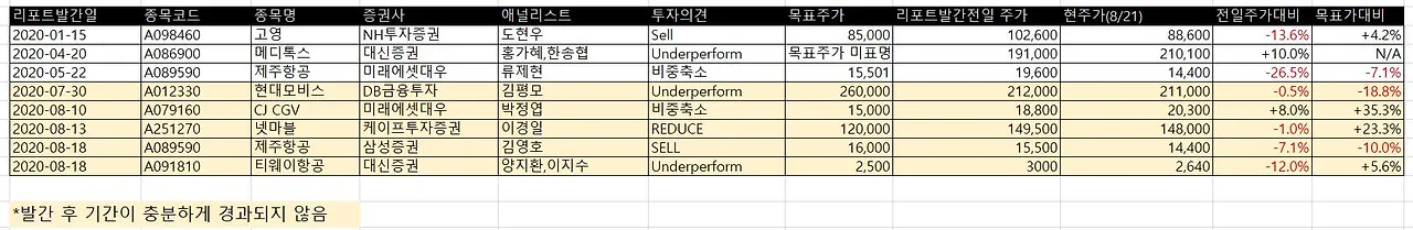 2020년의 3분의 2가 지나가는 이 시점에 국내증권사 리포트 중 매도의견을 표명한 리포트를 찾아봤습니다.