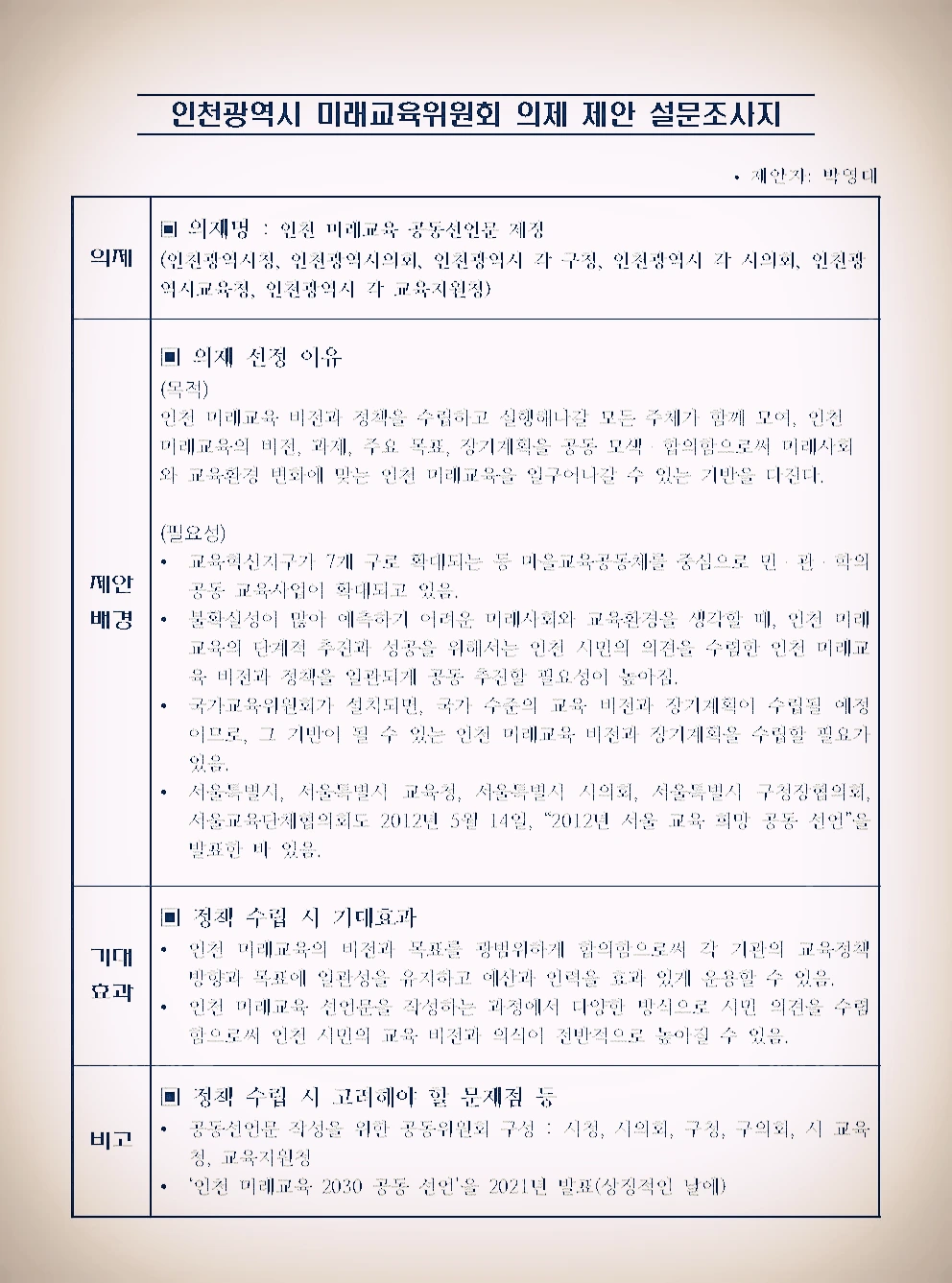 1기 인천광역시 미래교육위원회가 활동을 시작하면서 가장 먼저 한 일은 시민과 위원을 대상으로 의제 제안을 받는 것이었다. 나 역시 시민으로서 위원으로서 의제 제안서를 제출했는데, <2030인천미래교육 공동비전선언>을 추진하자는 제안서였다.