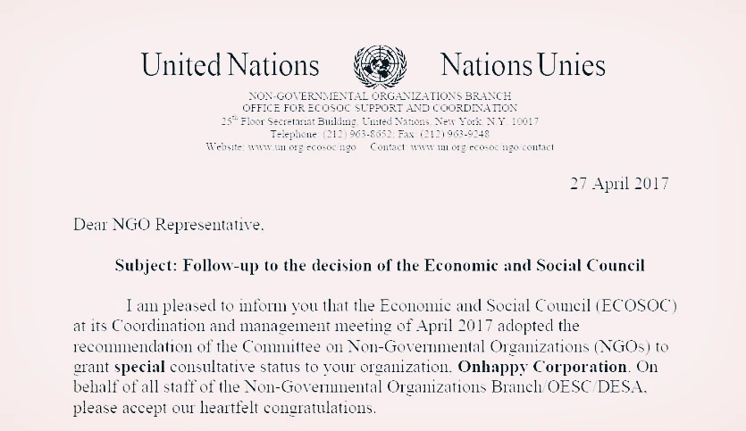 온해피 성장에 분수령이 된 것은 2017년 4월 유엔 경제사회이사회(ECOSOC; Economical and Social Council) 특별협의지위를 얻은 일이었다. 온해피가 유엔 ECOSOC 특별협의지위를 얻은 건 우리나라 NGO로서는 28번째였다. 1998년부터 약 20년 동안 28개 단체만 지위를 얻을만큼 까다로운 자격 조건을 갖추어야 했다. 도움을 받을 사람과 기관도 없어서 끊임없이 연구하면서 부딪혔다.